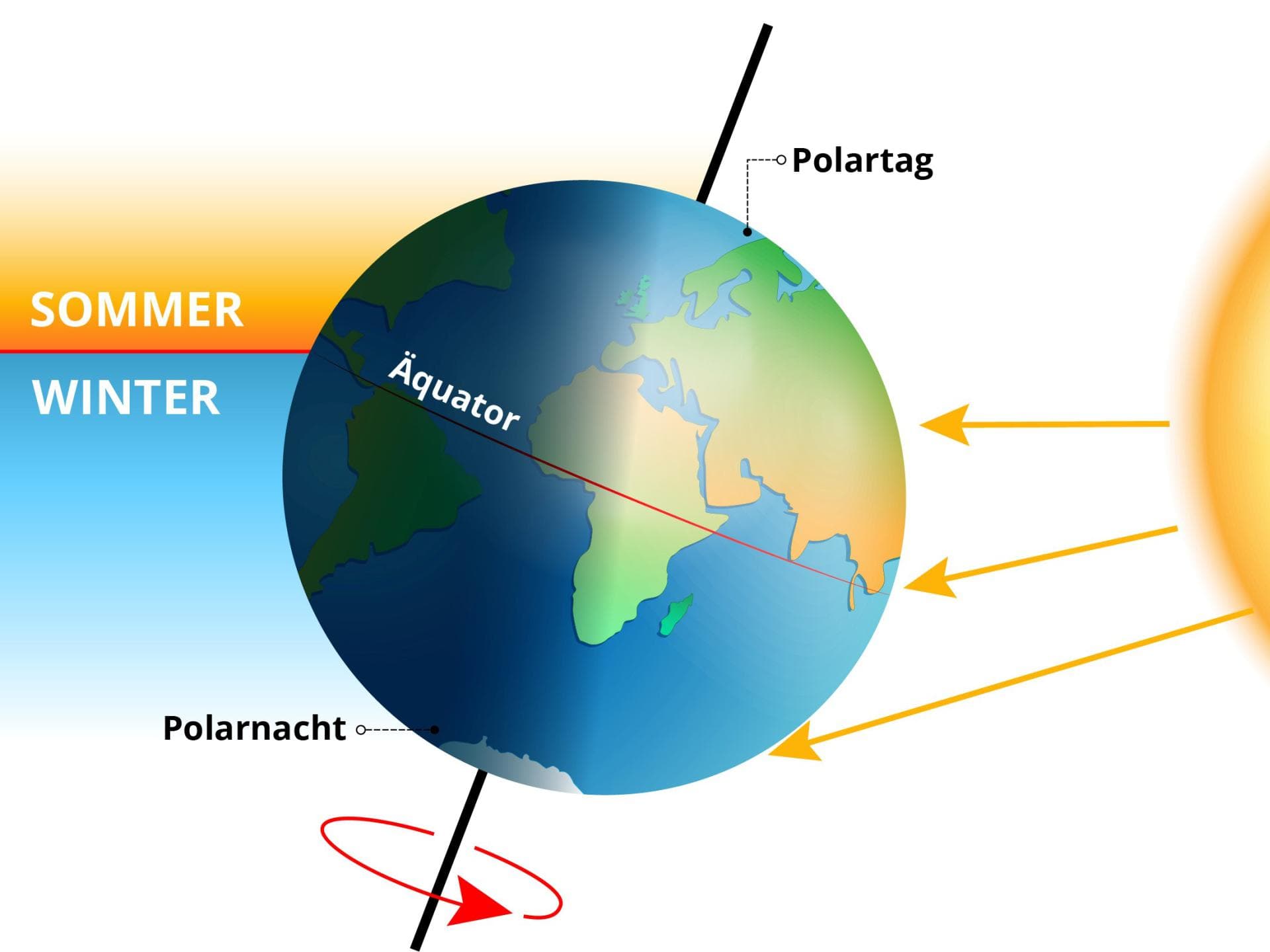 Doch nicht jeder Mensch auf der Erde kommt in den Genuss der Jahreszeiten. So sorgt die Schieflage der Erde dafür, dass am Nordpol für ein halbes Jahr ununterbrochen die Sonne scheint – auch wenn sie sich teils nur knapp über dem Horizont hält. Dieses Phänomen wird als Polartag bezeichnet. Danach folgt ein halbes Jahr Dunkelheit: die Polarnacht. Am Südpol ist das genau umgekehrt. Und wer sich am Äquator, der Mitte der Erde, aufhält, erlebt jeden Tag im Jahr gleich lang. Es herrscht praktisch ununterbrochen Sommer.