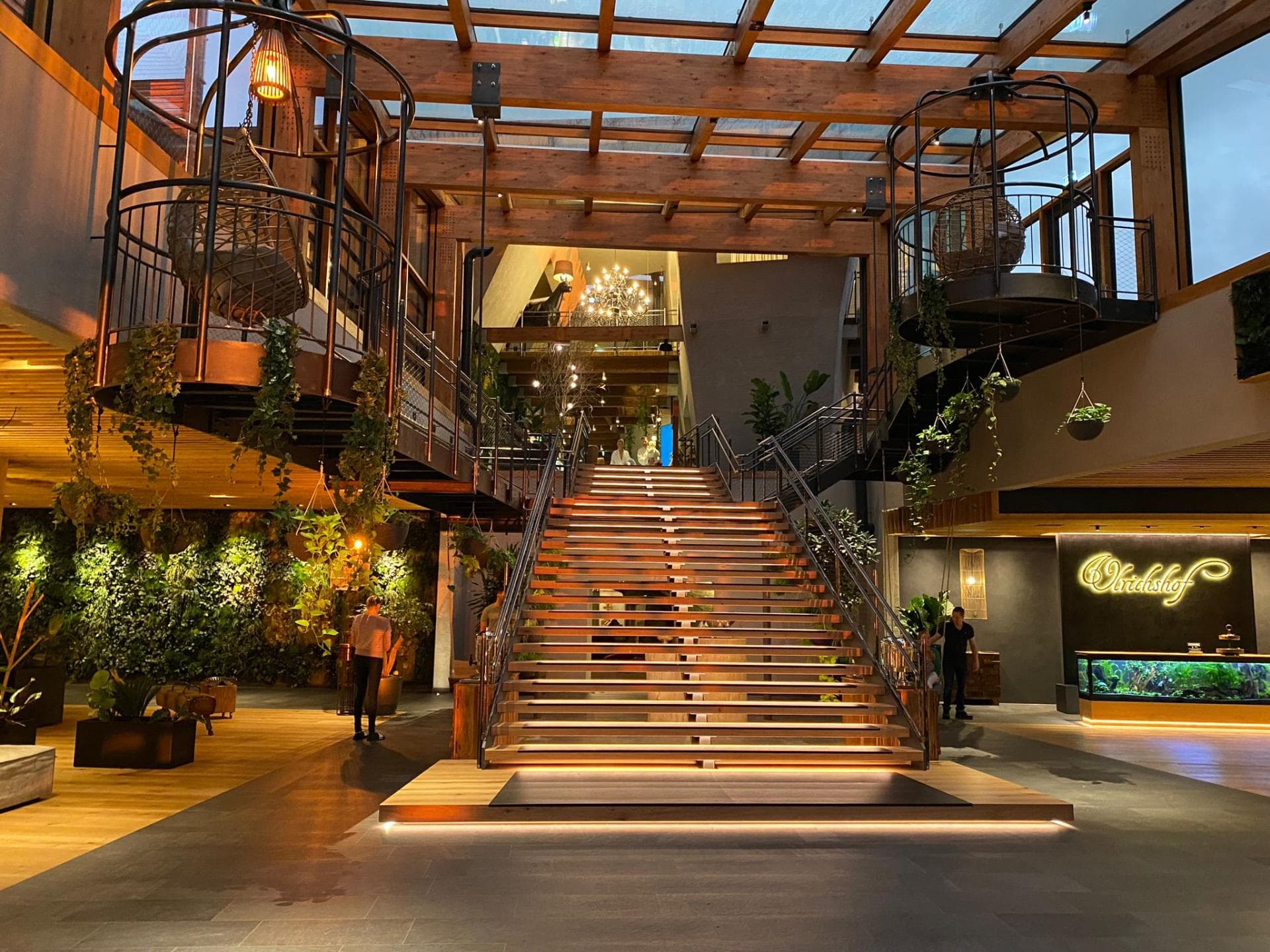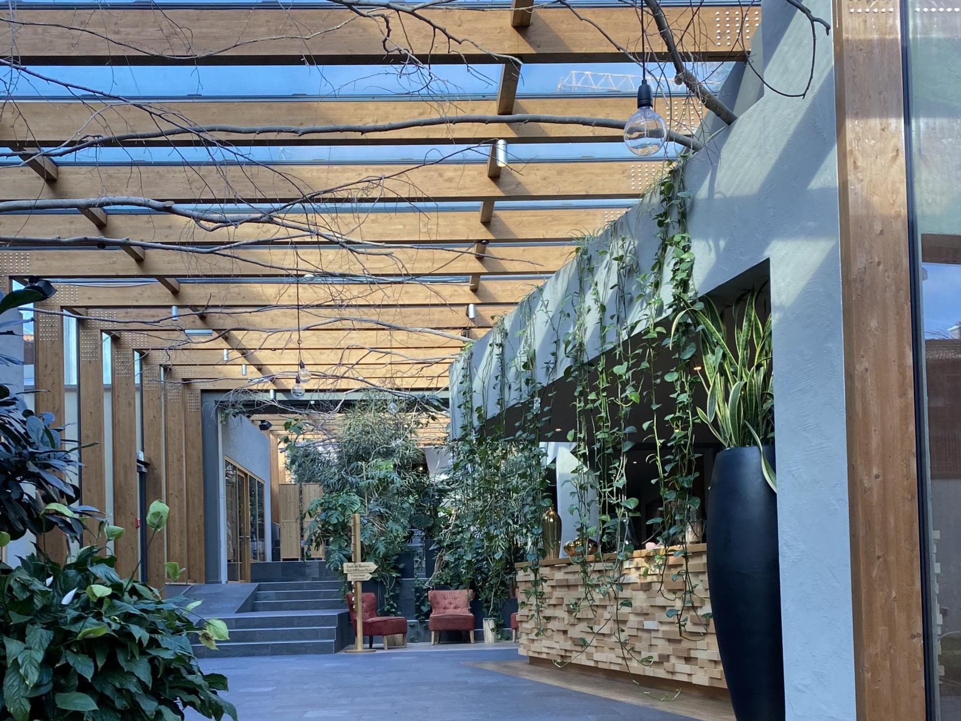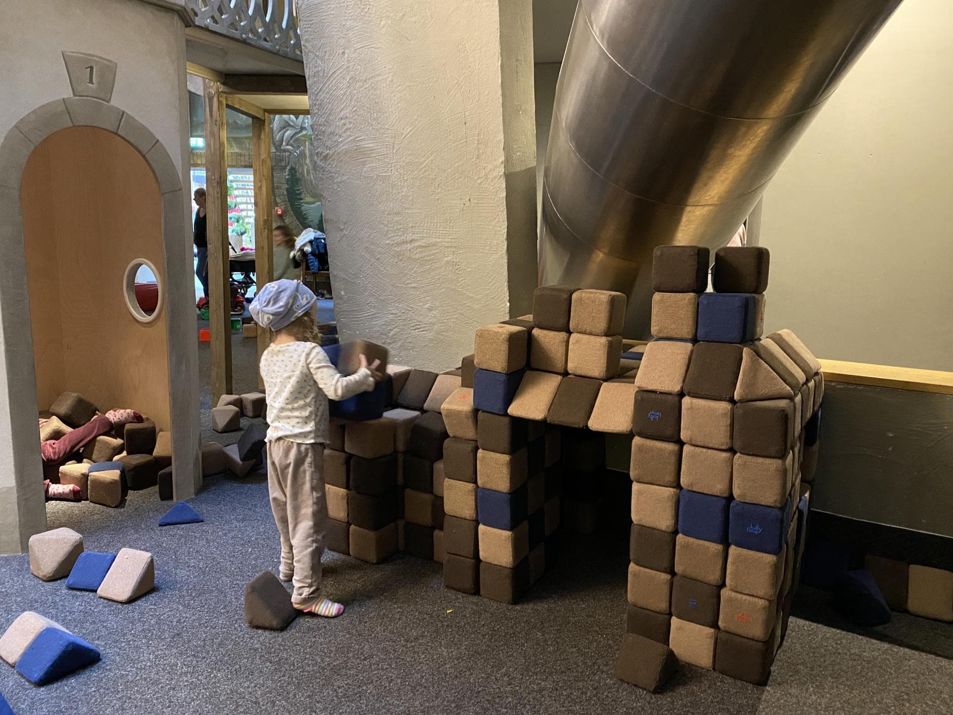 Wir betreten die Eingangshalle des Familienhotels und sind direkt beeindruckt: So stylisch hatten wir uns das nicht vorgestellt. Mein erstes Vorurteil wurde direkt entkräftet, denn früher dachte ich immer, Familienhotels sind kunterbunte Anlagen mit "Pizza, Pommes und Spaghetti"-Buffet. Doch hier hängen von der Decke viele grüne Pflanzen, alles ist eher in dezenten Farben gehalten und durch große Fenster lässt sich in die schöne Natur draußen blicken. Im ersten Moment komme ich mir gar nicht vor, als stünde ich in einem Familienhotel, doch auf den zweiten Blick sehe ich in jeder Ecke etwas, was Kinder entdecken können: Ein Holzpferd zum Klettern, allerlei Spiele und direkt hinter der Rezeption gibt es einen Indoor-Spielplatz, der aussieht wie eine riesige Burg mit zig verwinkelten Gängen und zwei Rutschen. Meine Tochter tobt sich erst mal aus, während wir mit einem Sekt in der Hand darauf warten, eingecheckt zu werden.