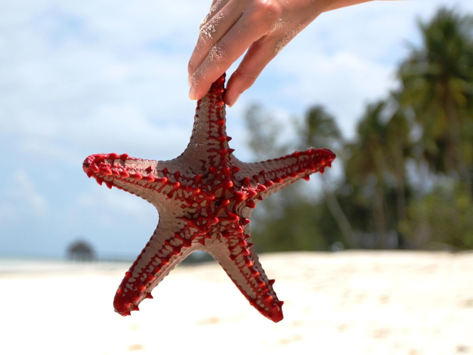 Die roten Stacheln des Lincks Walzenseesterns sind zwar ganz schön spitz, piksen aber nicht. Er ist einer von unzähligen Meeresbewohnern, denen man bei einem Schnorchelausflug ganz nah kommt. Sansibars Unterwasserlandschaft ist einzigartig.