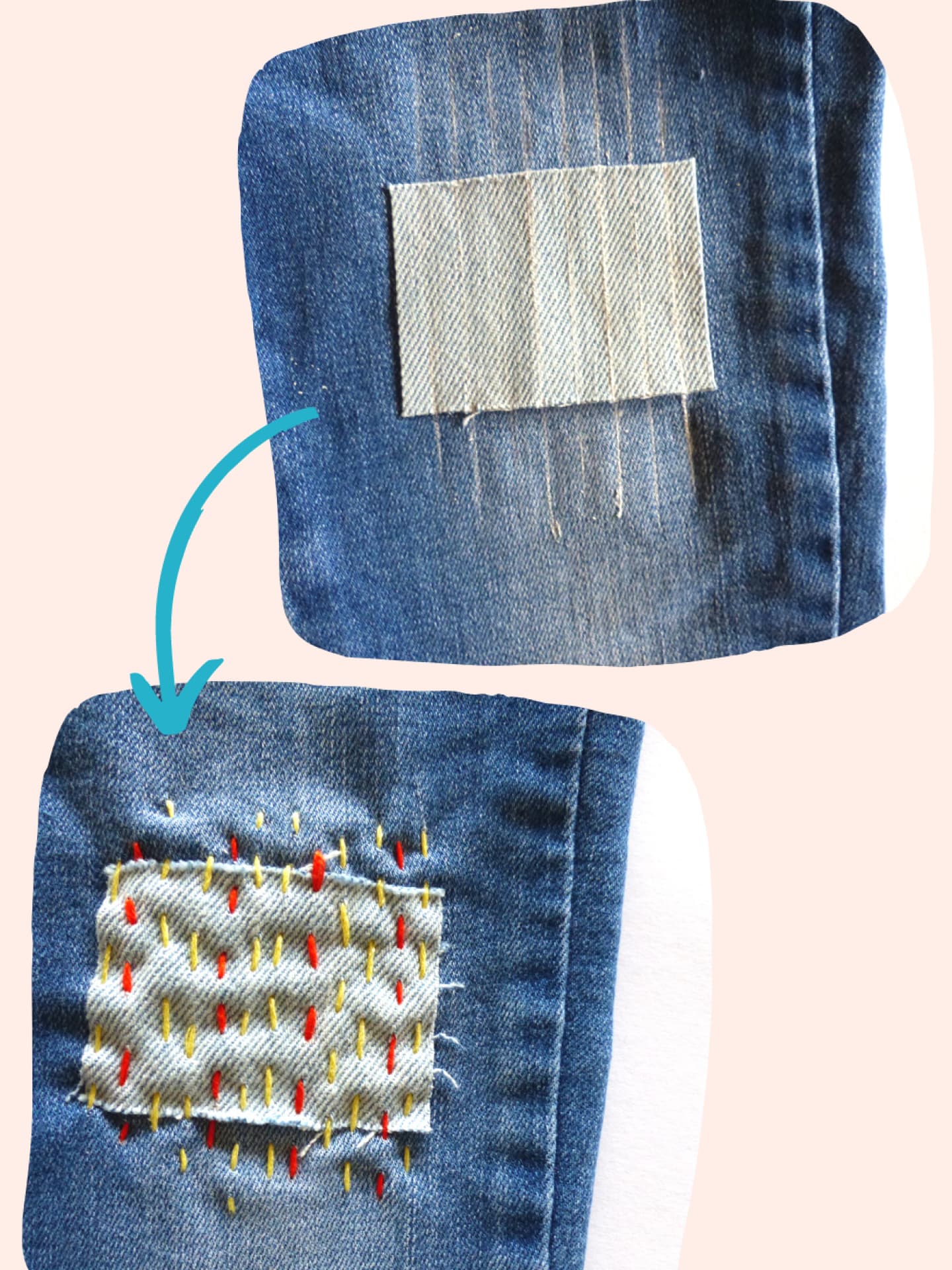 Ob ihr den Flicken von innen oder außen annäht, ist Geschmacksache. Fixiert ihn mit etwas (!) Textilkleber. Zeichnet dann mit einem Lineal senkrechte Linien über den Flickstoff und das Kleidungsstück. Nun näht ihr mit einem bunten Stickgarn die vorgezeichneten Linien nach. Anfang und Ende des Garns auf der Innenseite verknoten, fertig.