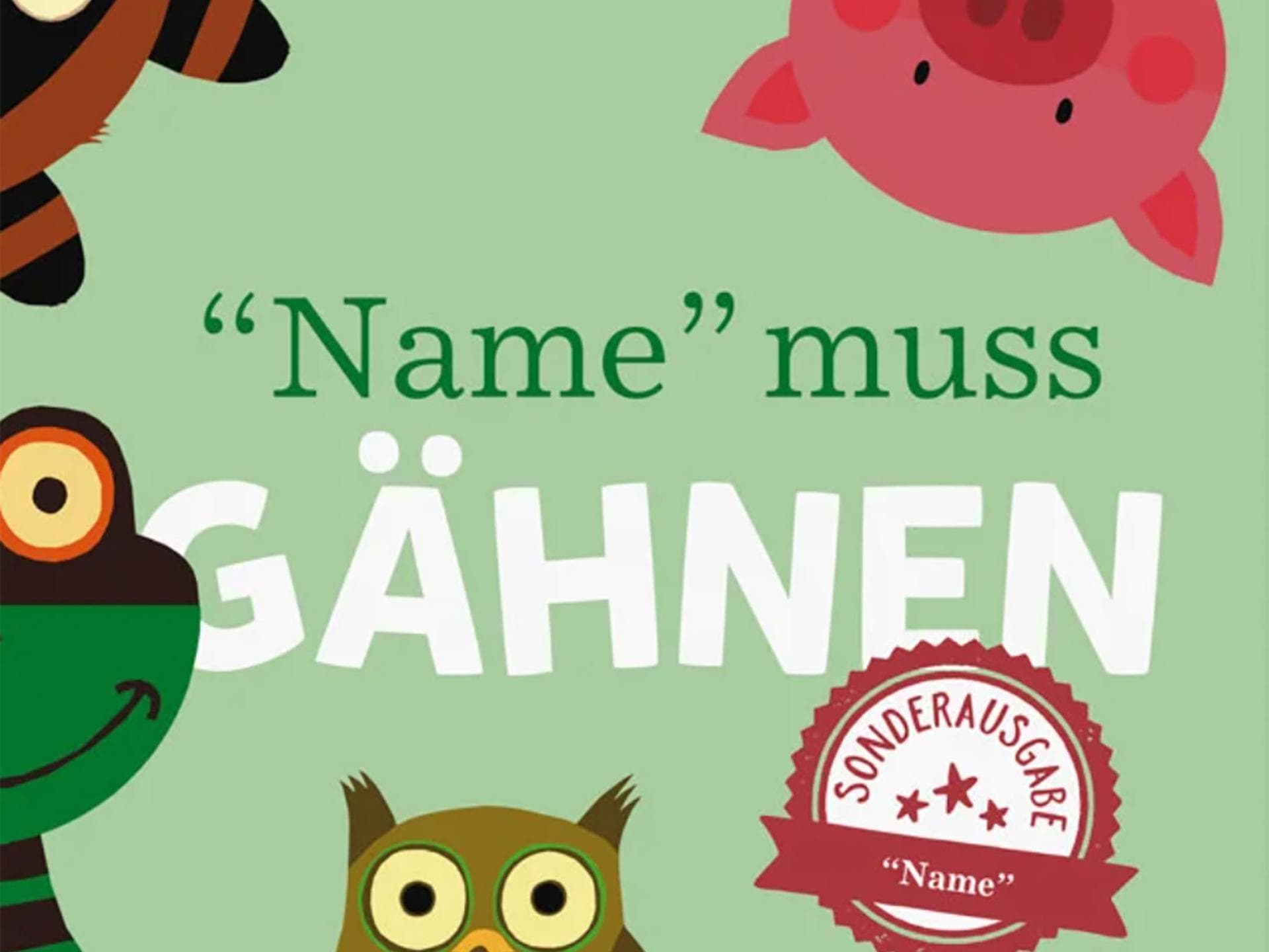 Viel Gähnerei verbirgt sich hinter den großen Klappen dieses Einschlafklassikers, denn alle Tiere sind sehr müde. Die XXL-Sonderanfertigung bezieht kleine Leser mit Foto und persönlicher Anrede mit ein.