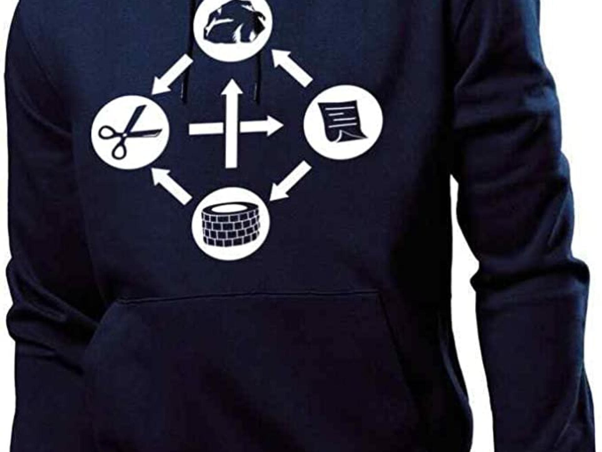 Auch ziemlich witzig ist der Hoodie, auf dem die vier Zeichen prangen. Noch dazu zeigen Pfeile, welches Zeichen gegen welches andere Zeichen gewinnt. Dieser Pulli wird mit Sicherheit Blicke auf sich ziehen. Der Hoodie besteht zu 50 Prozent aus Baunwolle und zu 50 Prozent aus Polyester. Erhältlich in verschiedenen Farben und Größen.