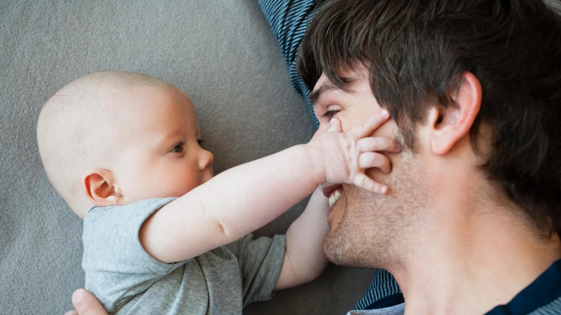 Lieblingspielzeug eures Babys sind jetzt seine eigenen kleinen Hände. Es steckt die Finger in den Mund und untersucht eine Hand mit der anderen. Auch das Zusammenspiel von Hand und Auge wird nun fleißig geübt; Euer Kind patscht heftig nach allem, was es interessiert – also auch nach eurem Gesicht.