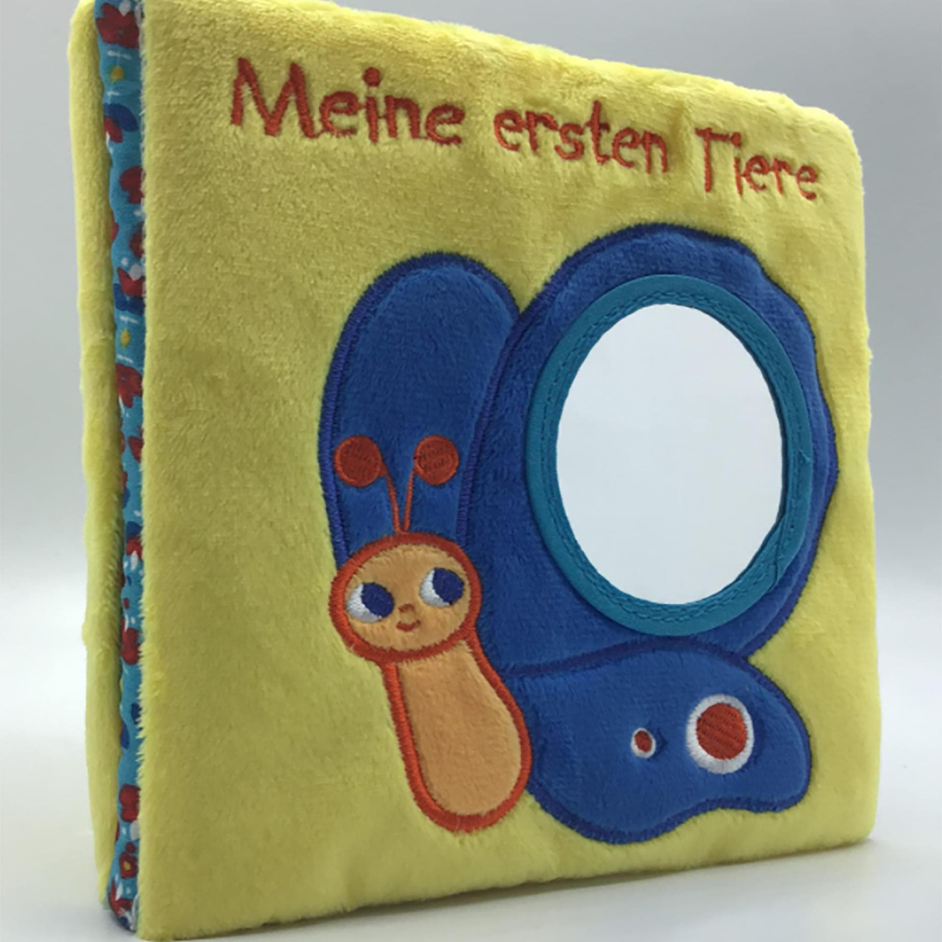 Ein weiteres Fühlbuch des Arena Verlags zeigt lustige, bunte Tiere auf weichen Seiten. Mit einem Spiegel und knisterndem Sound werden die Sinne angeregt und die Motorik gefördert.