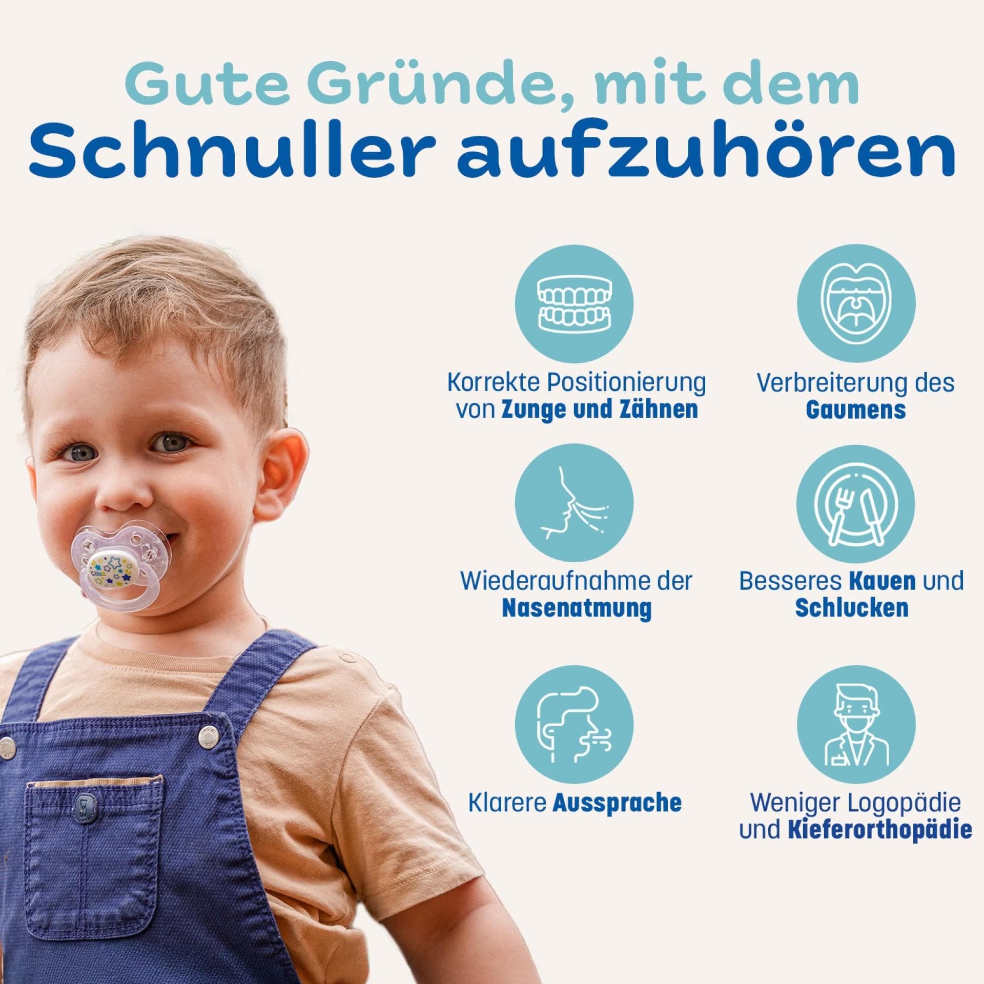 Denn ab dem Alter von 2-3 Jahren kann ein anhaltender Gebrauch die Mundentwicklung, die Zahnstellung oder bestimmte Funktionen wie Atmung und Artikulation beeinflussen. Die entscheidende Frage lautet daher nicht, ob, sondern wie dieser Übergang gelingen kann: ohne Druck, ohne Machtkämpfe und mit möglichst viel Sicherheit für das Kind.