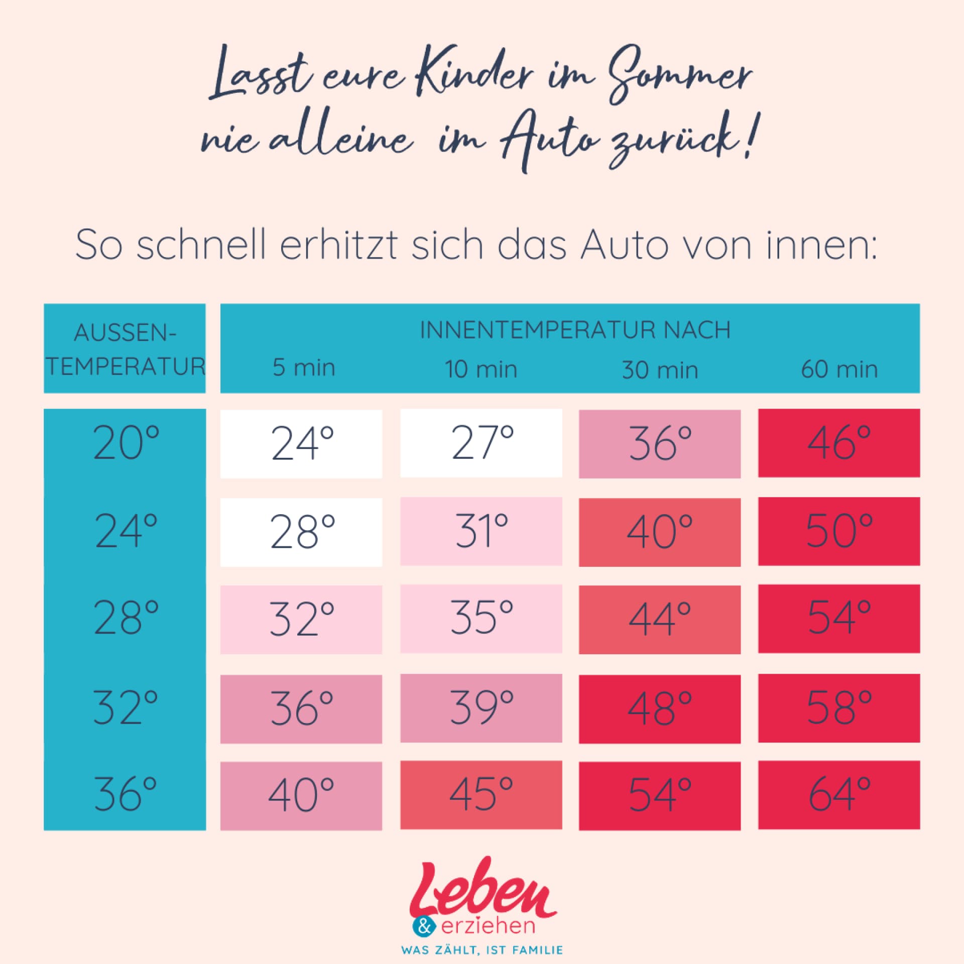 In der Babyschale liegen kleine Kinder zwar gemütlich und sicher – im Sommer ist es in diesen Kindersitzen aber auch besonders warm, da am Rücken keine Luftzirkulation stattfindet. Beim Autofahren sollten Eltern daher darauf achten, dass Babys nicht zu warm angezogen sind. Zudem gilt: "Kleine Kinder dürfen niemals alleine im Auto gelassen werden – nicht mal eine Minute“, warnt Dr. Kahl. "Die Temperatur im Innenraum kann schnell auf bis zu 70 Grad steigen. Das ist lebensgefährlich! Selbst geöffnete Fenster können die Hitzeentwicklung nicht sicher verhindern." Wie schnell sich ein Auto im Sommer aufheizt, zeigt diese Grafik: