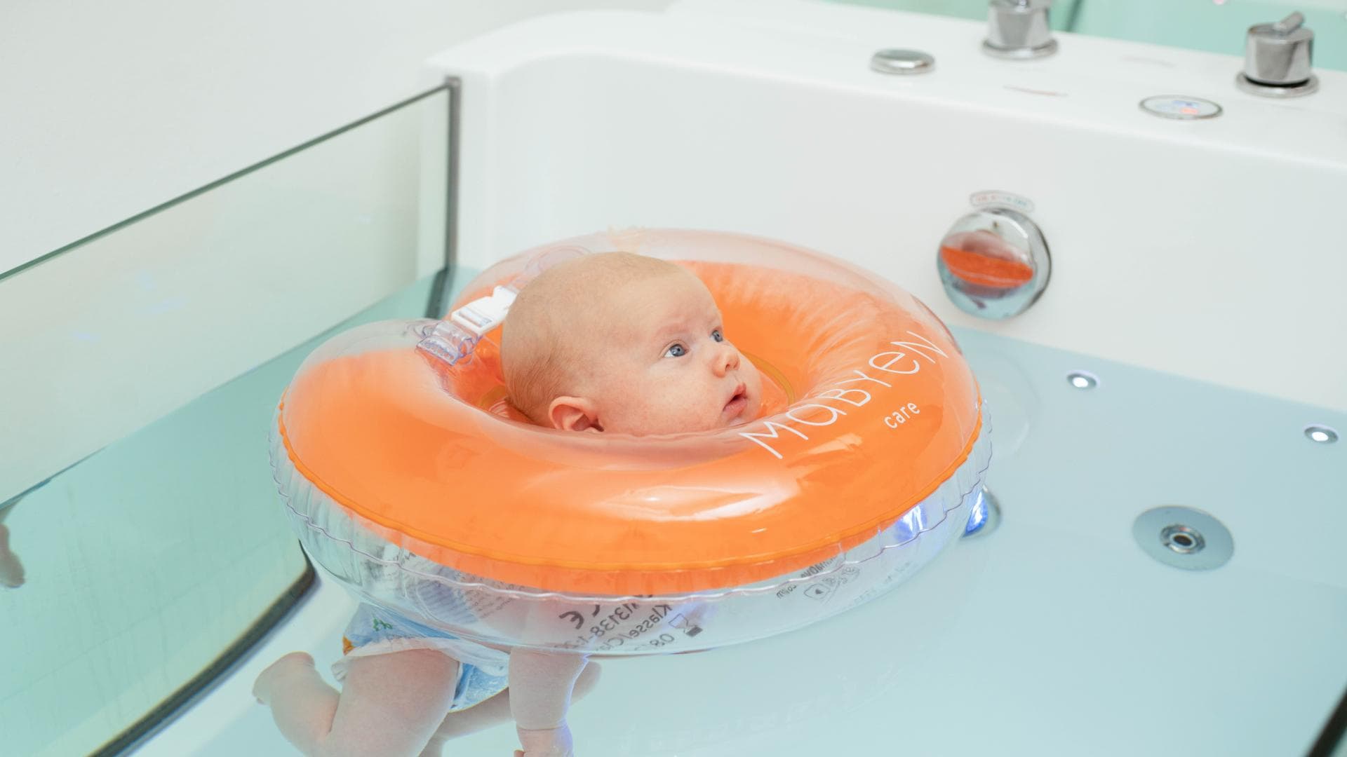 26 bis 29 Euro fallen für die besondere Bade-Einheit an. Das sogenannte Floating ist eine von der englischen Schwimmtherapeutin Laura Severus entwickelte Hydrotherapie. "Ein spezieller Schwimmring sorgt dafür, dass das kleine Köpfchen über Wasser bleibt – Arme und Beine sind frei, können strampeln und schwerelos durchs warme Wasser gleiten", erklärt mir Tanja Holzmann. Die fünffache Mama ist Hebamme und Markenbotschafterin für das Unternehmen Mabyen (das nicht nur den Düsseldorfer Baby-Spa betreibt, sondern auch eine eigene Babypflegelinie entwickelt hat). "Floating ist so superschön für Babys zwischen zwei Wochen und sechs Monaten, weil es an die geborgene Zeit im Mutterleib erinnert."