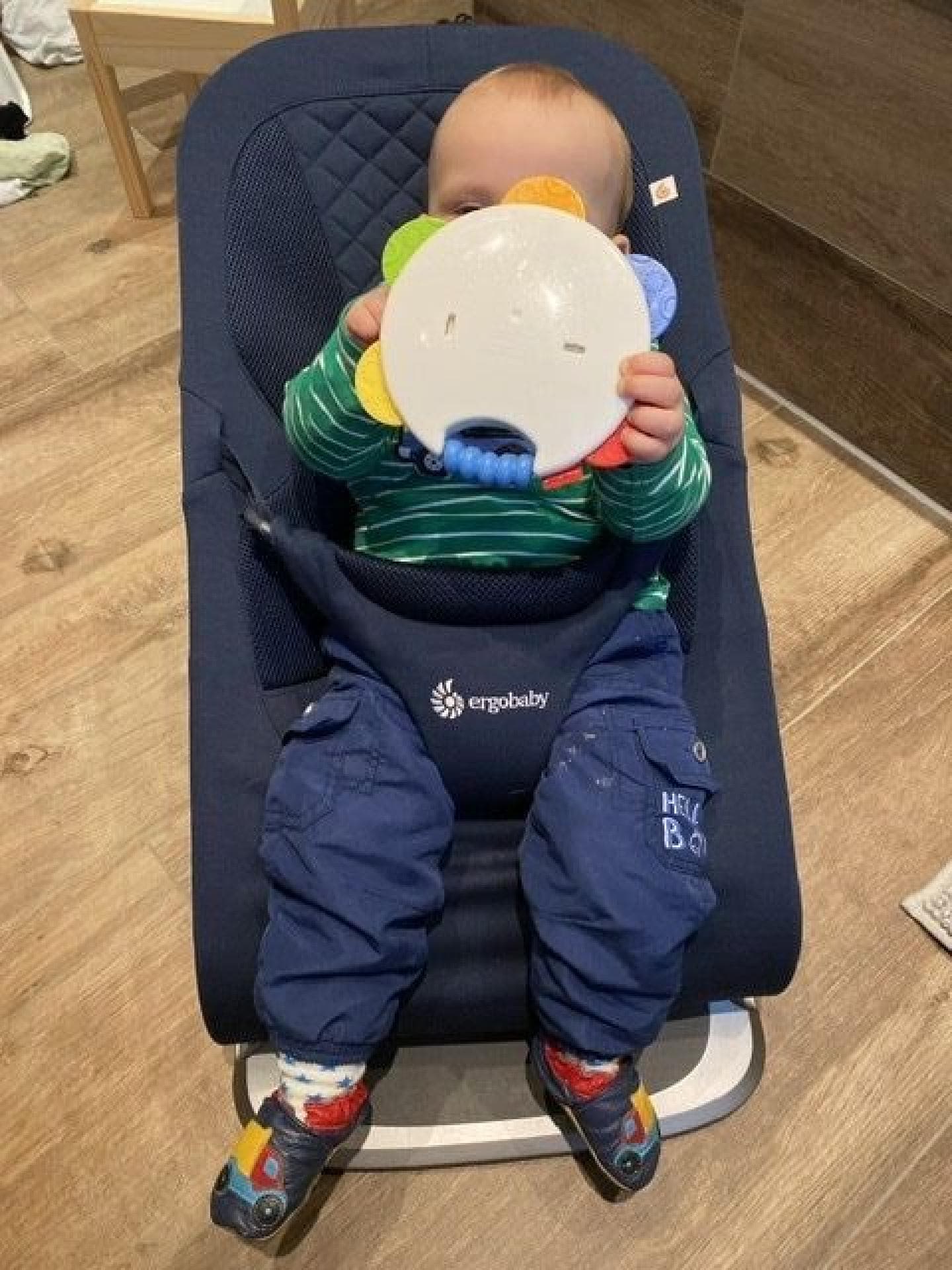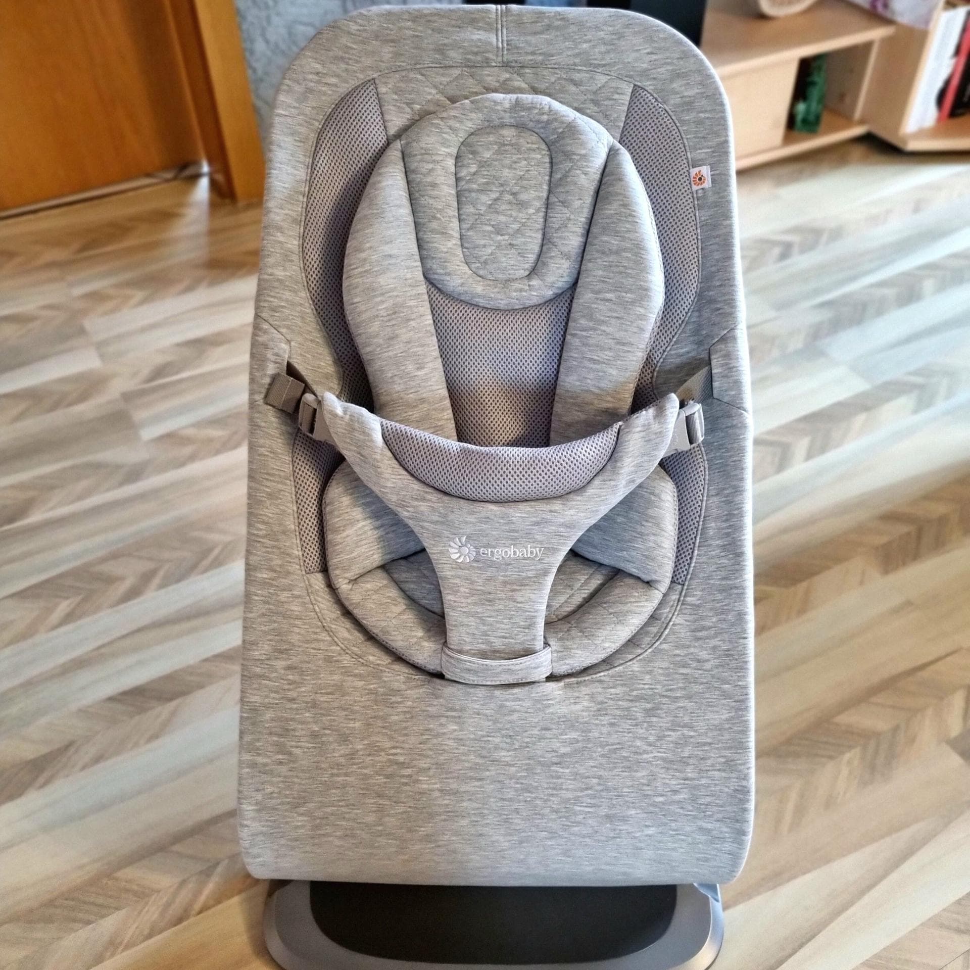 Beim Auspacken des Bouncers fiel uns direkt dessen sehr gute Rutschfestigkeit auf. Die Babywippe hat drei Höhenpositionen. Das Verstellen der Höhenpositionen sowie das Zusammenklappen des Bouncer gehen kinderleicht. Wir benutzen den Bouncer gerne im Badezimmer, wenn wir duschen oder auch mal alle zusammen im Bad sind. Unser Sohn ist gerne im Bouncer und das, obwohl er sich schon super bewegen, selber stehen und sich hochziehen kann. Er meckert kein bisschen, wenn er darin sitzt.