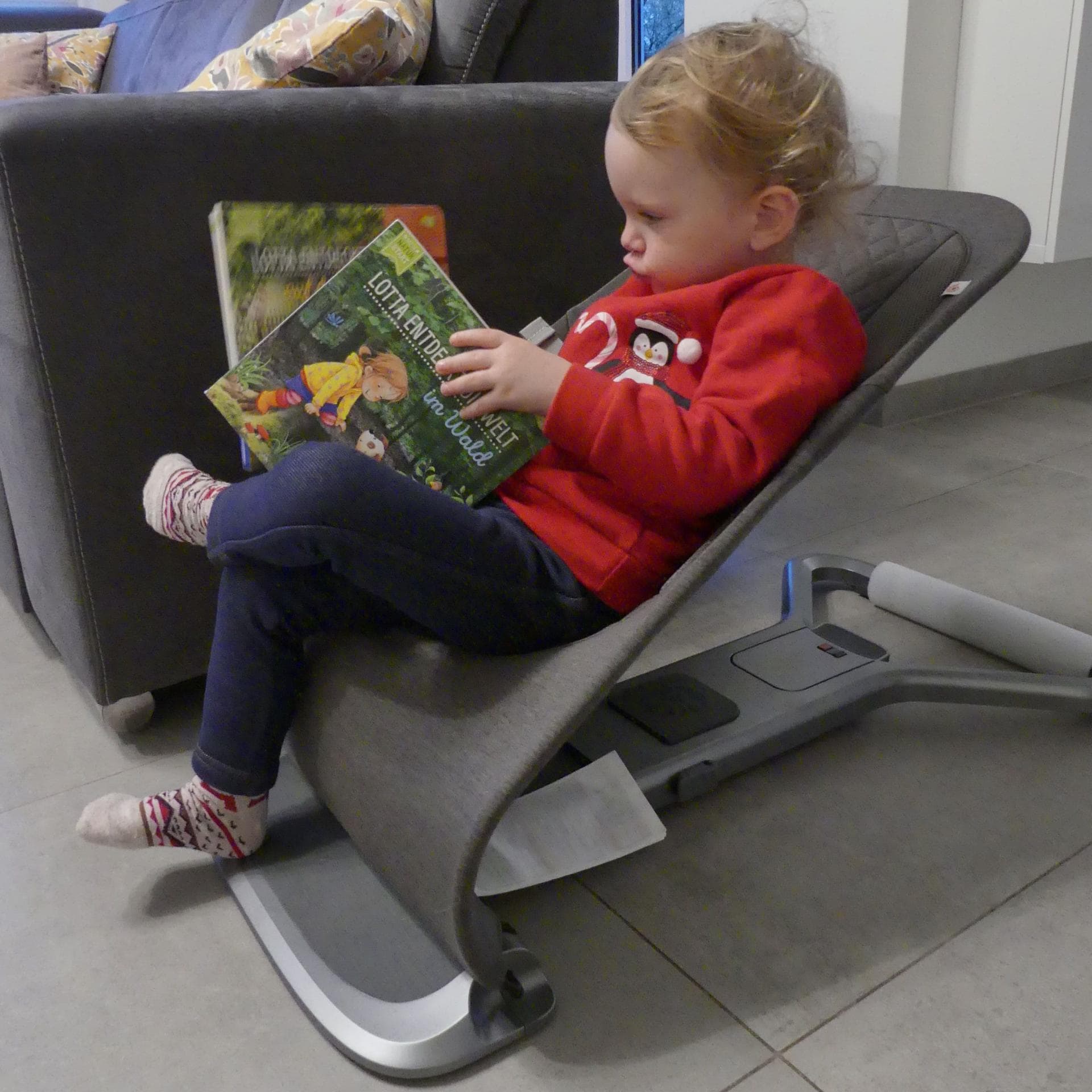 Meine Tochter war zum Testzeitpunkt zweieinhalb Jahre alt und zwölf Kilogramm schwer. Sie nutzt den Bouncer sehr gerne als Sitzgelegenheit. Eine Sicherung sorgt dafür, dass die Sitzneigung fest ist und nicht versehentlich verstellt werden kann. Generell macht die Wippe einen sehr hochwertigen Eindruck.