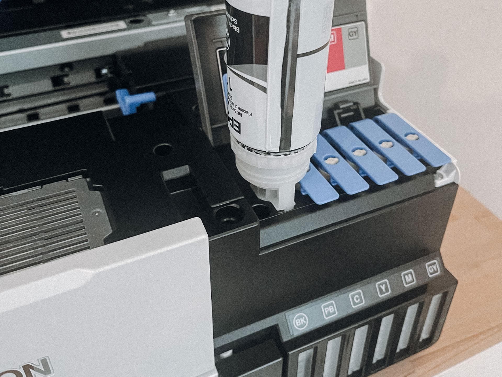 Der Drucker besticht durch sein zeitloses Aussehen. Zudem kommt, dass der Drucker recht klein ist und somit gut positioniert werden kann. Die Betriebsanleitung ist bildlich beschrieben und einfach erklärt. Es besteht die Möglichkeit sich eine App runterzuladen oder die Einrichtung manuell vorzunehmen. Ich habe es mit der App versucht, allerdings ist leider die Verbindung immer abgebrochen. Daher habe ich die Einrichtung über den Drucker vorgenommen. Nach dem Einschalten werden die Tintentanks befüllt. Das Befüllen ist wirklich sehr einfach: Man schraubt den Deckel der Flasche ab, öffnet den Tank und setzt die Flasche rauf. Der Tank befüllt sich automatisch. Nachdem innerhalb kürzester Zeit die Tanks befüllt sind, startet man den Befüllvorgang in dem Drucker. Dann wird Papier eingelegt und ein Druckmuster gedruckt. Bei mir passte bei sofort alles. Danach wird noch die Ausrichtung kalibriert. Fazit: einfache und intuitive Einrichtung die auch ohne besondere Kenntnisse vollzogen werden kann. Wir haben den Drucker mit unterschiedlichen Papieren getestet. Besonders den Fotodruck haben wir unter die Lupe genommen. Das "Epson Photopapier glossy" ist ein glänzendes Papier, welches sich super für Fotoalben eignet. Der Druck ist bei allen Bildern farbgetreu und scharf. Das alles in ca.20-25 Sekunden pro Foto. Das Epson "Premium semigloss" Papier haben wir für professionelle Fotografien genutzt. Als erstes fiel die tolle Haptik auf, welche an Seidenraster erinnert. Das Ergebnis ist klasse und überzeugt durch Klarheit, Brillanz und Haptik. Nachdem wir den Drucker ausgiebig getestet haben, haben wir den Füllstand mit Erstaunen begutachtet. Es war lediglich ein Viertel verbraucht. Laut Epson kann man mit einer Tankfüllung 2300 Bilder drucken. Was wir dazu sagen können: Der Drucker ist äußerst effizient und sparsam bei hoher Qualität. Der Drucker überzeugt mit einer herausragenden Qualität nicht nur im Druck sondern auch in der Verarbeitung. Der Preis ist von Epson mit 719 Euro angegeben, was nicht gerade günstig ist, jedoch erhält man für das Geld einen hochwertigen Drucker mit vielseitigen Einsatzmöglichkeiten. Wir können den Drucker wärmstens empfehlen.