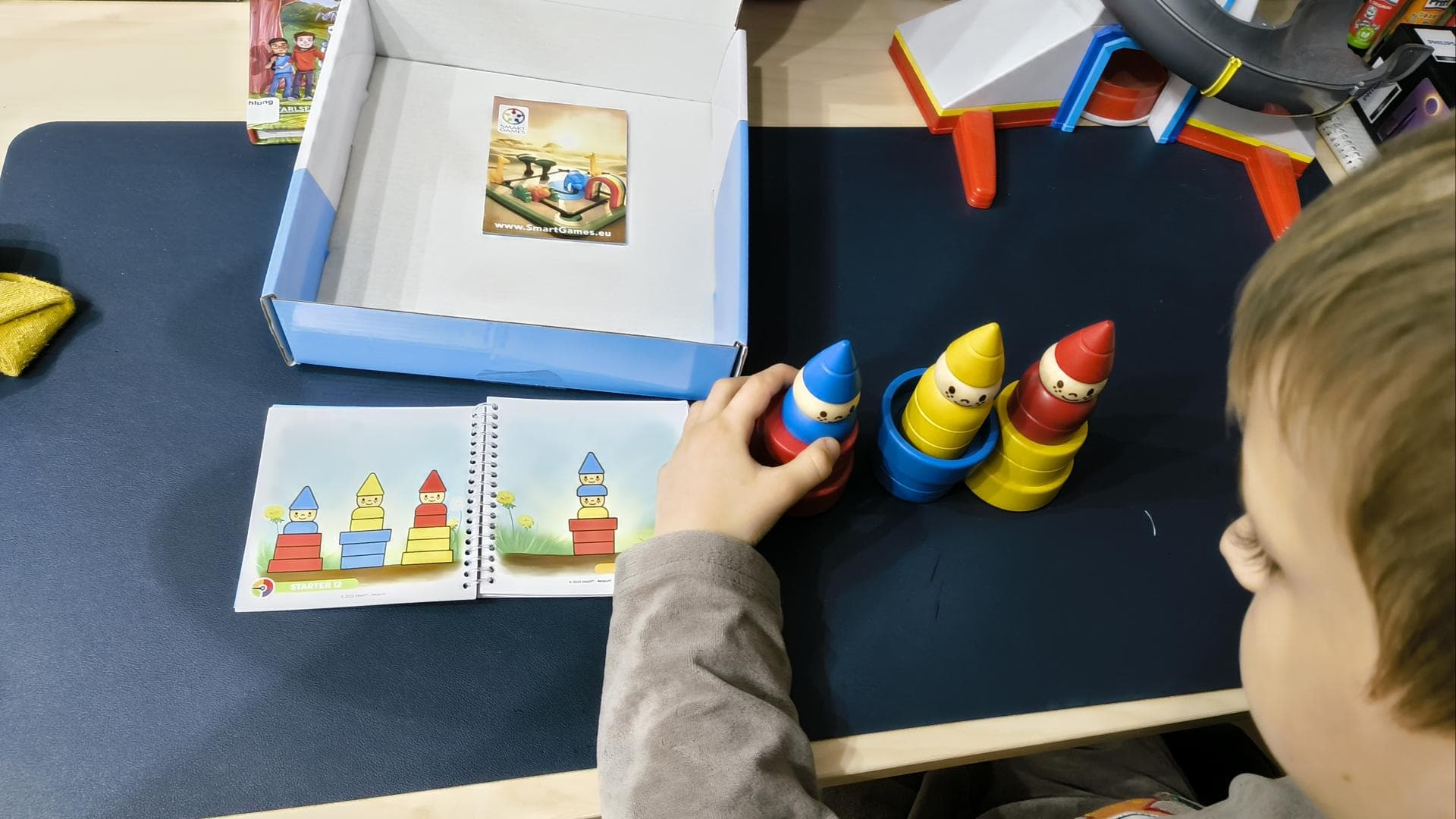 Das Lernspiel "Gartenwichtel" von SmartGames ist eine Art Legespiel, bei dem es gilt, vorgegebene Muster nachzustellen. Bei den Spielfiguren handelt es sich um je drei bunte Wichtel und Blumentöpfe in unterschiedlichen Größen. Ein kleines Ringbüchlein liefert Vorlagen in verschiedenen Schwierigkeitsgraden, sodass schon Dreijährige üben können, aber auch Sechsjährige noch geistig gefordert werden. Für die schwierigeren Aufgaben gibt es jeweils eine Lösung auf der Rückseite – bereits bei den Aufgaben der Junior-Stufe muss man manchmal etwas knobeln, da die Figuren auch ineinander gesteckt werden können. Dadurch ist die Farbe des bzw. der Wichtel nicht immer sichtbar und man muss klug kombinieren oder ausprobieren, um auf die Lösung zu kommen. Eine weitere Steigerung gibt es in der Experten-Stufe, denn es wird Nacht im Wichtel-Land und nun sind die Wichtel und Blumentöpfe teilweise grau. Nun gilt es, wirklich genau auf die Größe der Objekte bzw. die Anzahl der sichtbaren Ringe zu achten. Mein Sohn ist fast 6 Jahre alt und liebt das Spiel sehr. Die bunte Aufmachung hat direkt sein Interesse geweckt und er baut auch gern mit Bausteinen. Wir geben den "Gartenwichteln" insgesamt fünf Sterne, da es sich um ein kurzweiliges Lernspiel handelt, welches logisches Denken fördert und verschiedene Altersgruppen anspricht.
