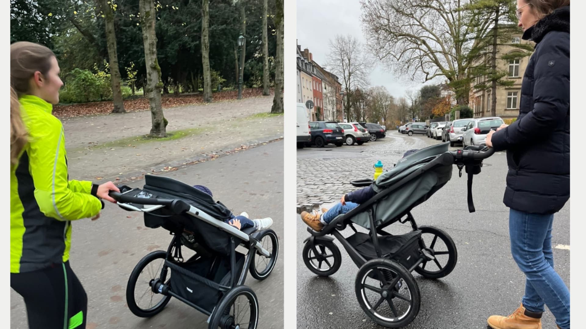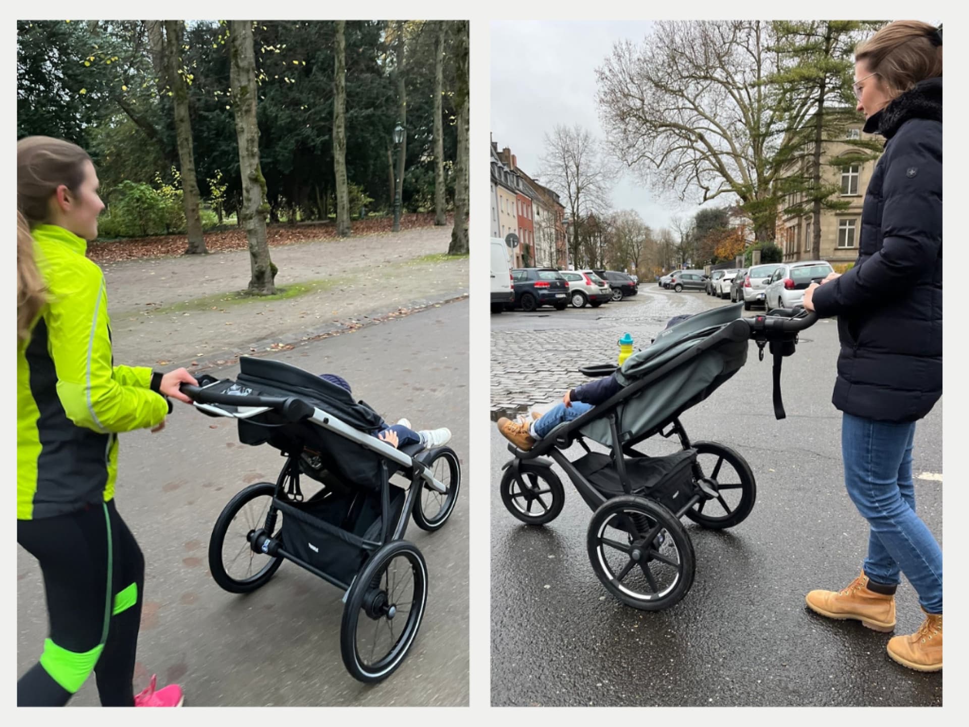 Uns hat besonders gefallen, wie ruhig der Wagen läuft. Man kann auf geraden Strecken problemlos ein konstantes Tempo halten, ohne ständig korrigieren zu müssen. Die Handbremse am Griff gibt zusätzliche Sicherheit, vor allem bergab. Unser Sohn sitzt stabil und sehr bequem, sodass er die Läufe richtig genießt. Er sitzt oft ganz entspannt da und erzählt uns, was er sieht. Inzwischen lässt er uns schon gar nicht mehr ohne ihn joggen gehen.