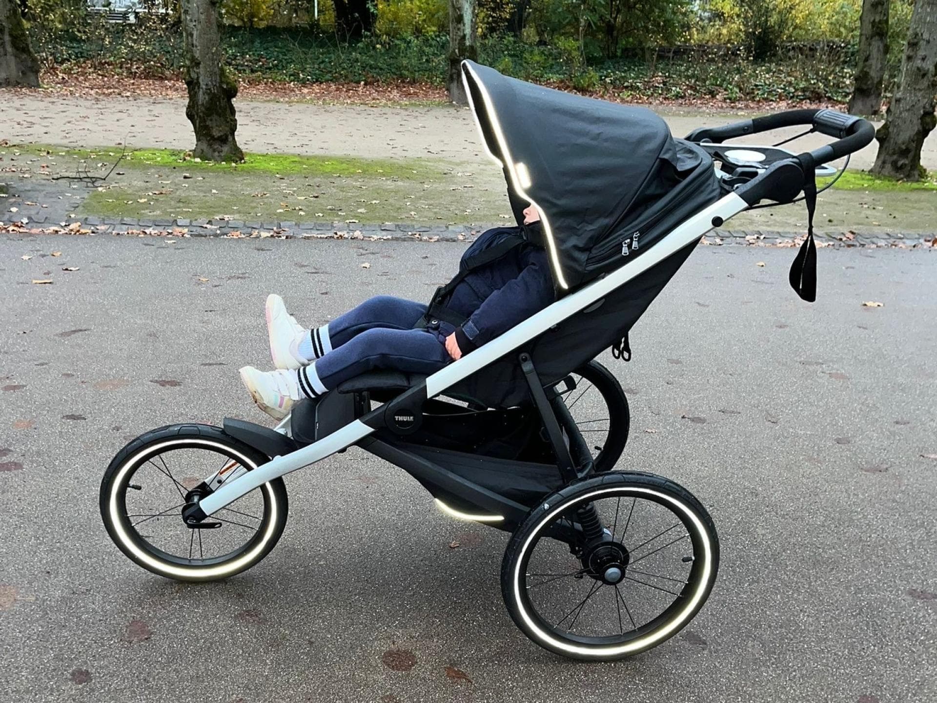 Wer regelmäßig läuft, wird den Thule Glide 3 lieben. Er ist eindeutig auf Sport ausgelegt: Mit seinem feststehenden Vorderrad, der windschnittigen Form und dem sehr leichten Rahmen rollt er fast von allein. Beim Laufen merkt man sofort, dass dieser Wagen für Geschwindigkeit gemacht ist. Die großen luftgefüllten Reifen und die gute Federung geben deutlich mehr Stabilität als ein gewöhnlicher Kinderwagen, auch wenn der Weg mal über Bordsteine, Schotter oder Wurzeln führt.