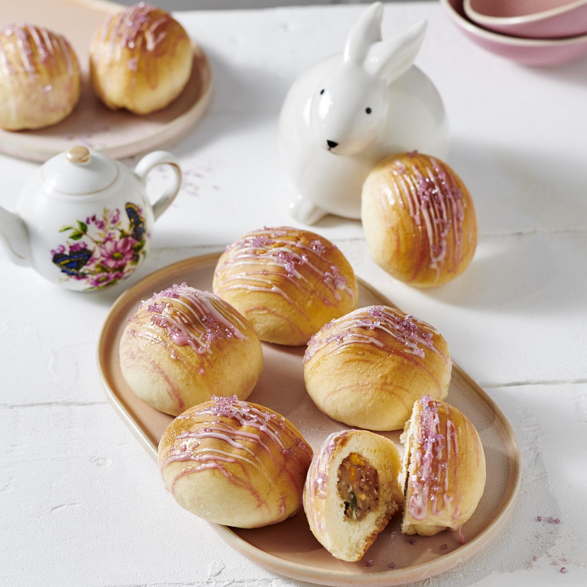 6. Eigelb mit 2 EL Milch verschlagen, Hasen damit einpinseln, mit Hagelzucker garnieren. Auf mit Backpapier belegten Blechen im Ofen in ca. 35 Min. goldgelb backen.