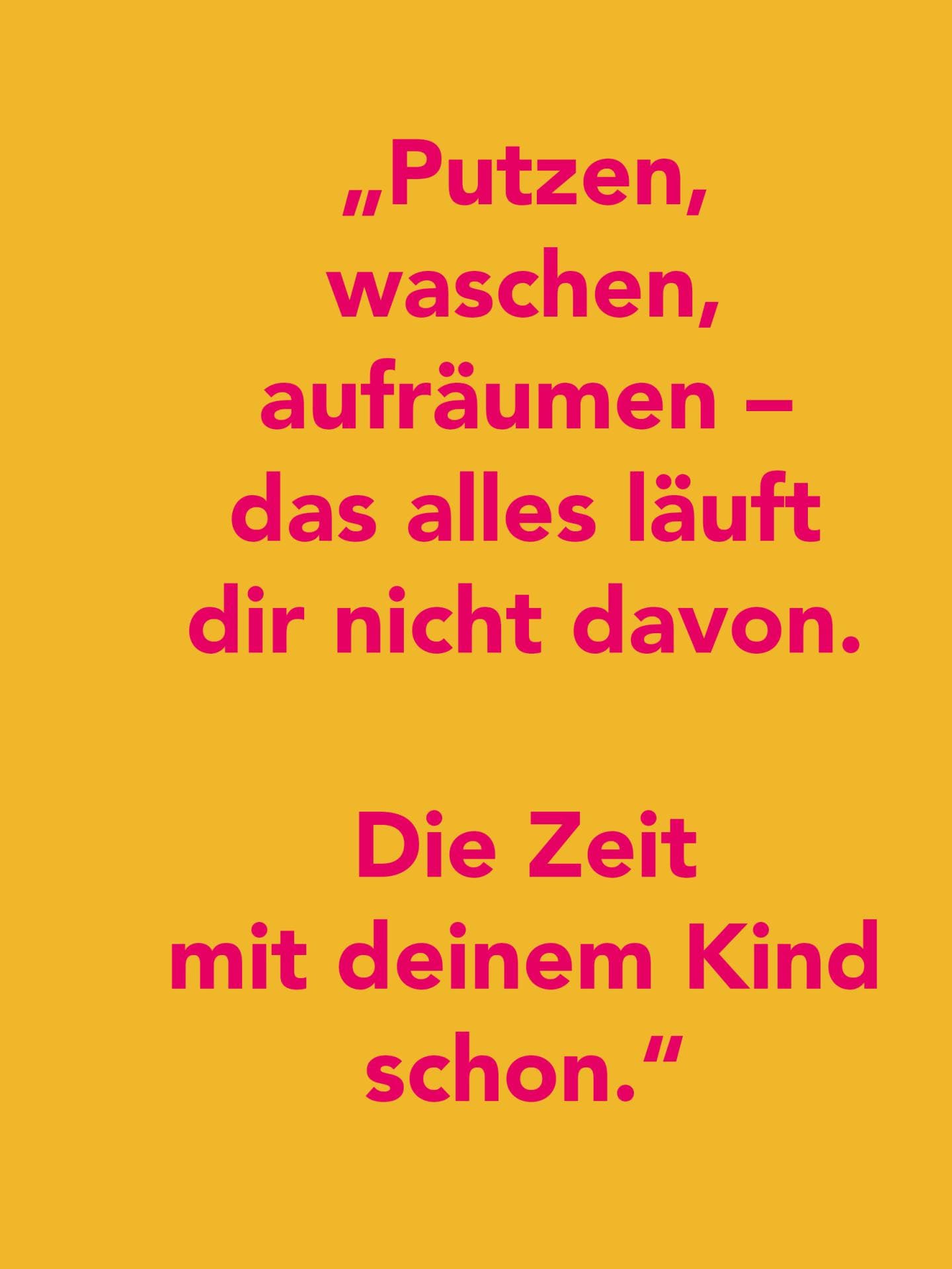 Es ist Freitag. Mein freier Tag. Die Kinder sind in der Kita und in der Schule. Ich trinke (Halleluja!) den gefühlt ersten heißen Kaffee der Woche und scrolle dabei durch Facebook. Gleich geh ich einkaufen, wasche Wäsche, räume auf. Ohne Kinder, jippie! Da klatscht es mir ins Gesicht. "Putzen, waschen, aufräumen... das alles läuft dir nicht davon! Die Zeit mit deinem Kind schon!"
