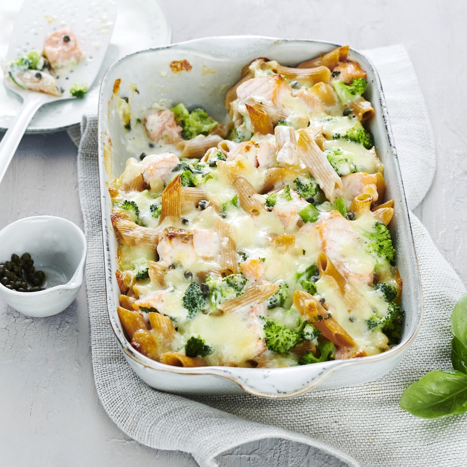Brokkoliauflauf mit Lachs und Vollkornpenne