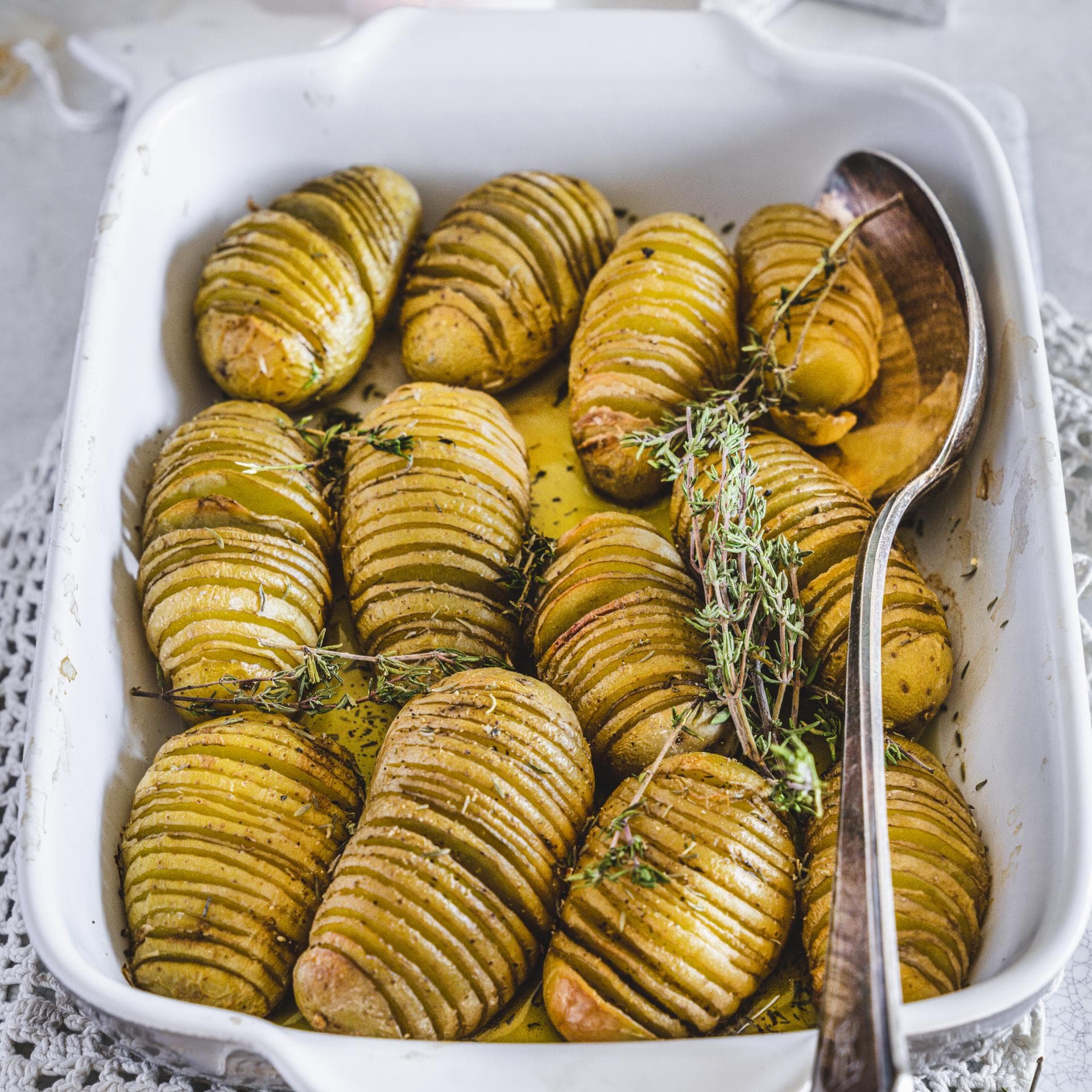 1. Die Kartoffeln waschen, trocken reiben. Auf die Arbeitsfläche jeweils zwischen 2 Holzkochlöffel legen. Die Kartoffeln dann mit einem großen scharfen Messer mehrfach ein- aber nicht durchschneiden. Nebeneinander in eine Auflaufform legen, dabei die dünnen Scheiben fächerartig auseinander drücken.