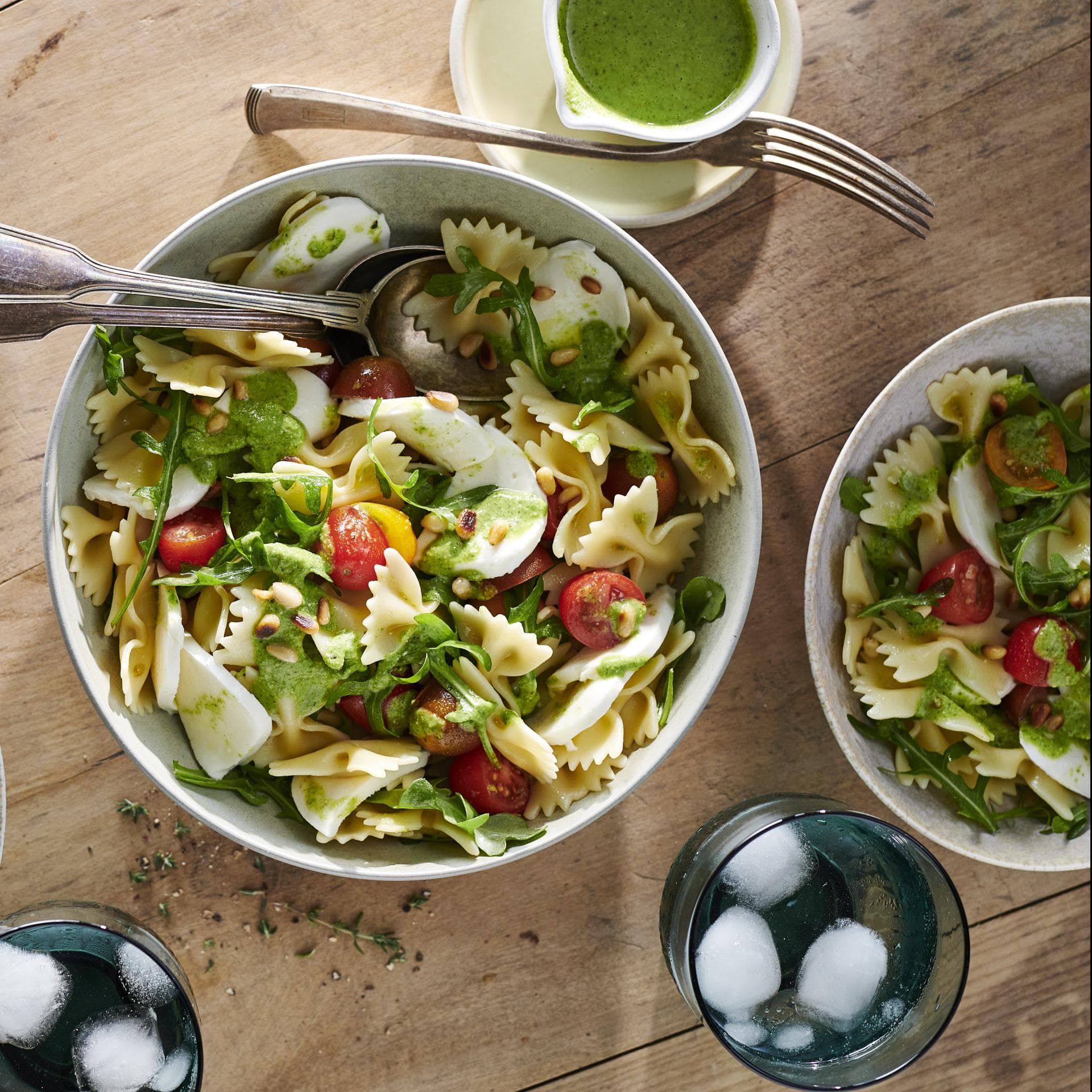 3. Mozzarella in Scheiben schneiden und mit den Nudeln und Tomaten anrichten. Das Pesto darüber träufeln und mit Rucola und Pinienkernen garnieren.