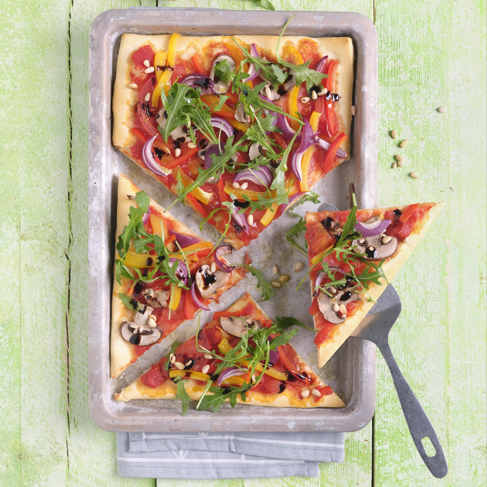 5. Den Rucola auf der Pizza verteilen, mit den Pinienkernen bestreuen. Mit Olivenöl und Balsamicoessig beträufeln, mit Meersalz und Pfeffer würzen und in Stücke teilen.