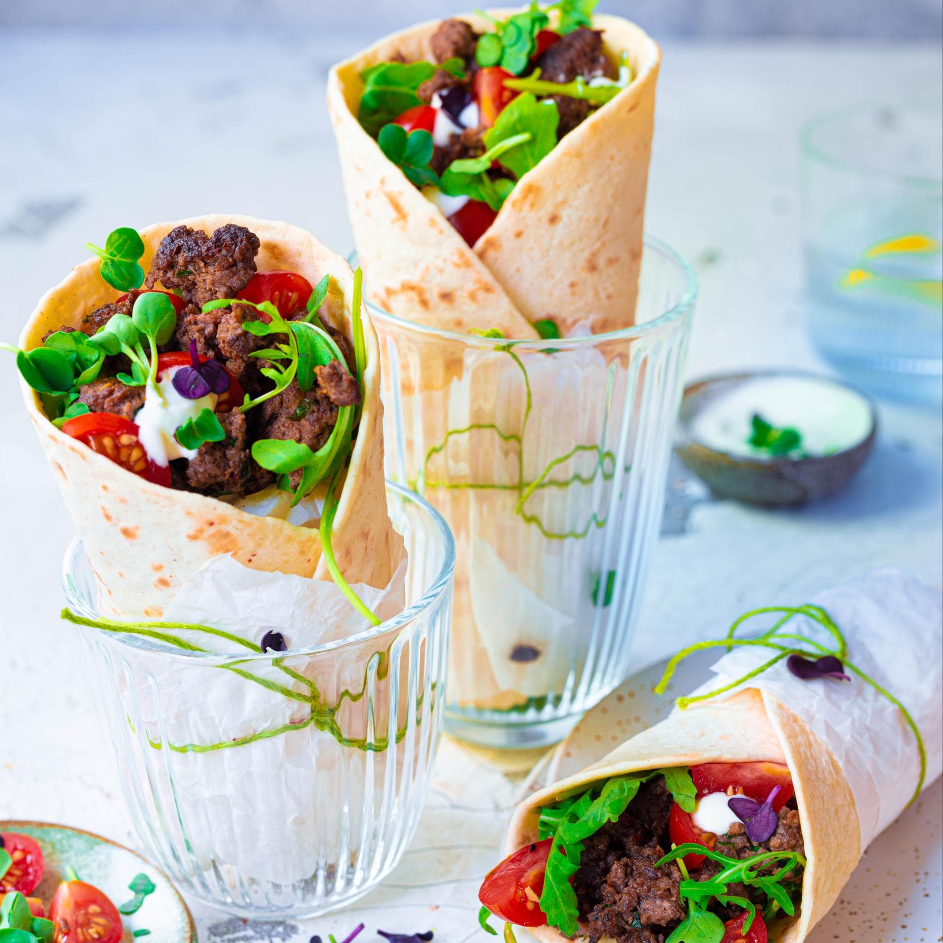 3. Tortillafladen in einer Pfanne oder im Ofen erwärmen, den Salat darauf verteilen. Mit der Sauren Sahne beträufeln. Das Hackfleisch mit den Tomaten darauf verteilen und mit den Kräutern toppen. Aufgerollt servieren.