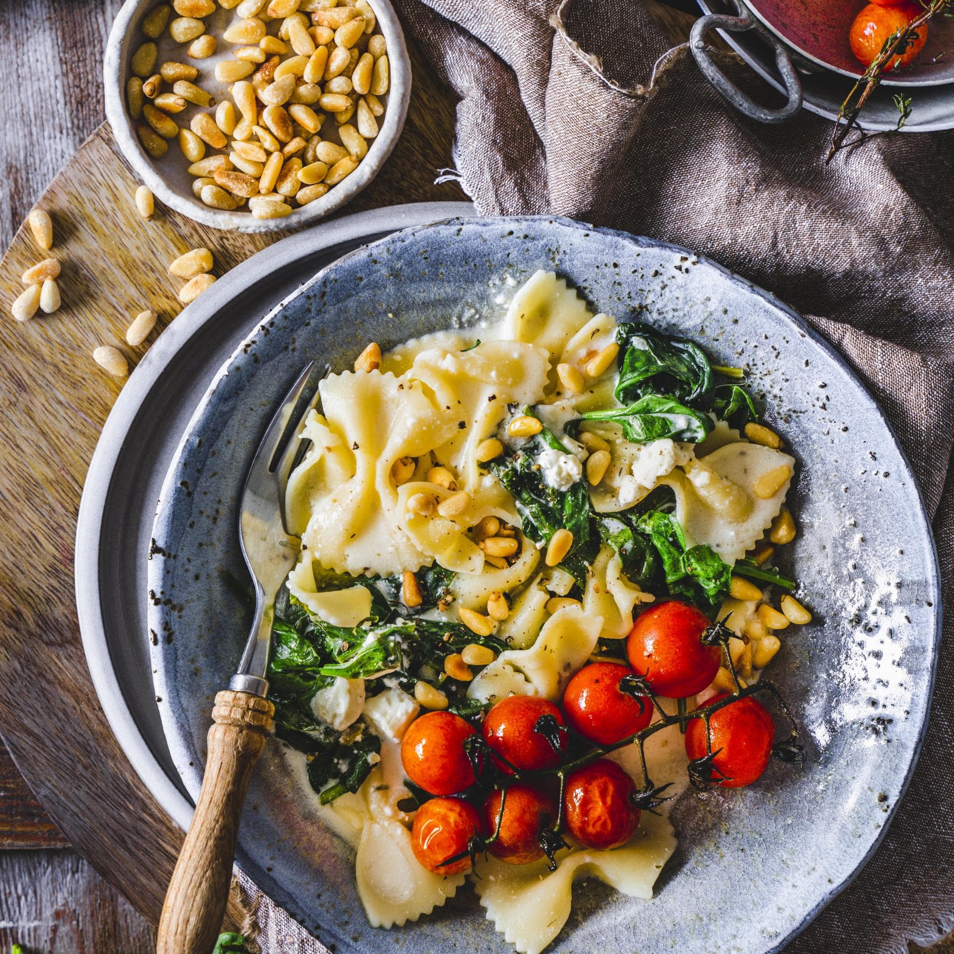 3. Nudeln mit etwas Kochwasser, der Spinatmischung, dem Frischkäse und dem Feta vermischen, mit Salz und Pfeffer abschmecken. Mit den Ofentomaten auf Tellern anrichten, mit den Pinienkernen garniert servieren.