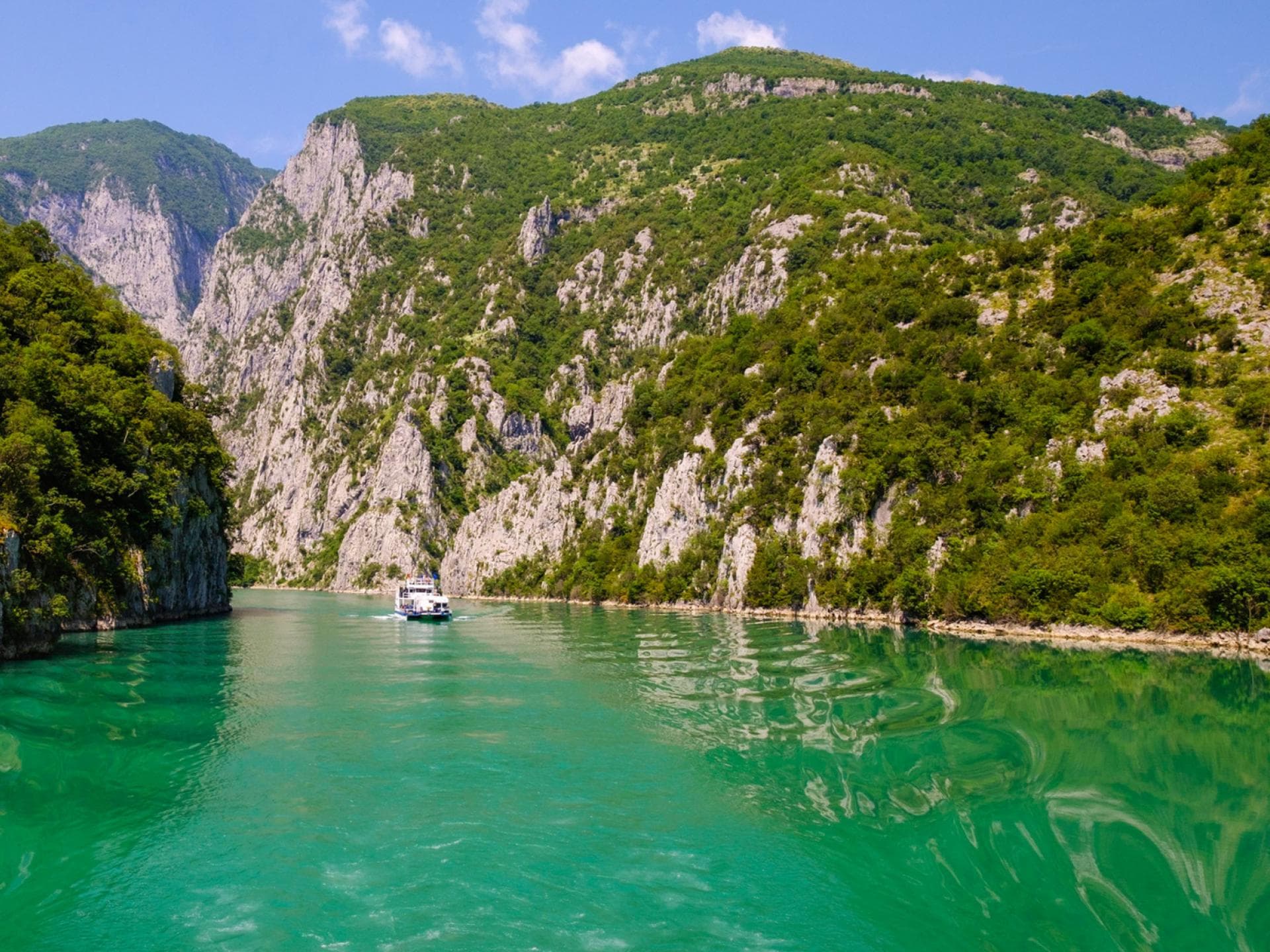 Nächste Station: die Autofähre auf dem Koman-Stausee. Hier würden sich Linus und Johan wie im Herr-der-Ringe-Land fühlen. Eng rücken die hohen Felsen während der Fahrt vom Ufer heran. Türkisgrün schimmert das Wasser. Bizarre Formationen befeuern die Fantasie: Ist das ein Bär, der da aus der Ferne winkt? Oder lauern ganz in der Nähe Orks in den dunklen Felsspalten?