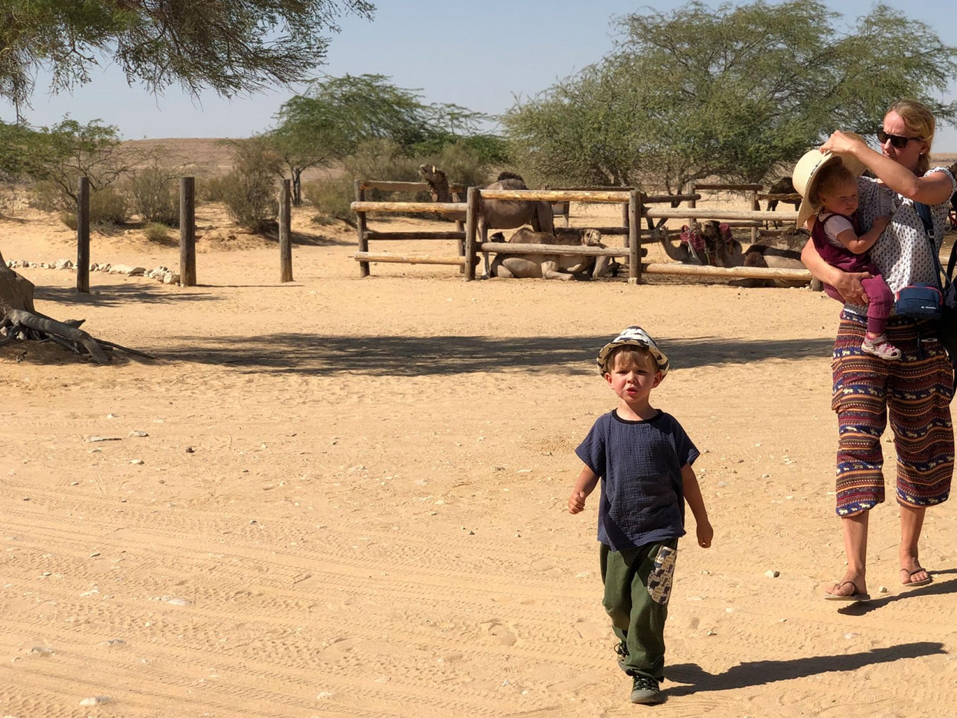 Auf dem Weg vom Toten Meer nach Jerusalem übernachten wir, fast als einzige Gäste, auf einer Kamelfarm in der Wüste Negev: ein tolles Erlebnis. Die einfache Holzhütte mit Ventilator ist tagsüber so heiß, dass man nur in den großen, überdachten Außenplätzen sitzen und bei einem kühlen Getränk oder Tee entspannen kann. Absolute Ruhe und ab und zu das Brüllen der Kamele. Als es um 18 Uhr schlagartig abkühlt, überrasche ich Julius mit einem Kamelausritt in die Wüste. Was für ein Highlight für einen Dreijährigen.