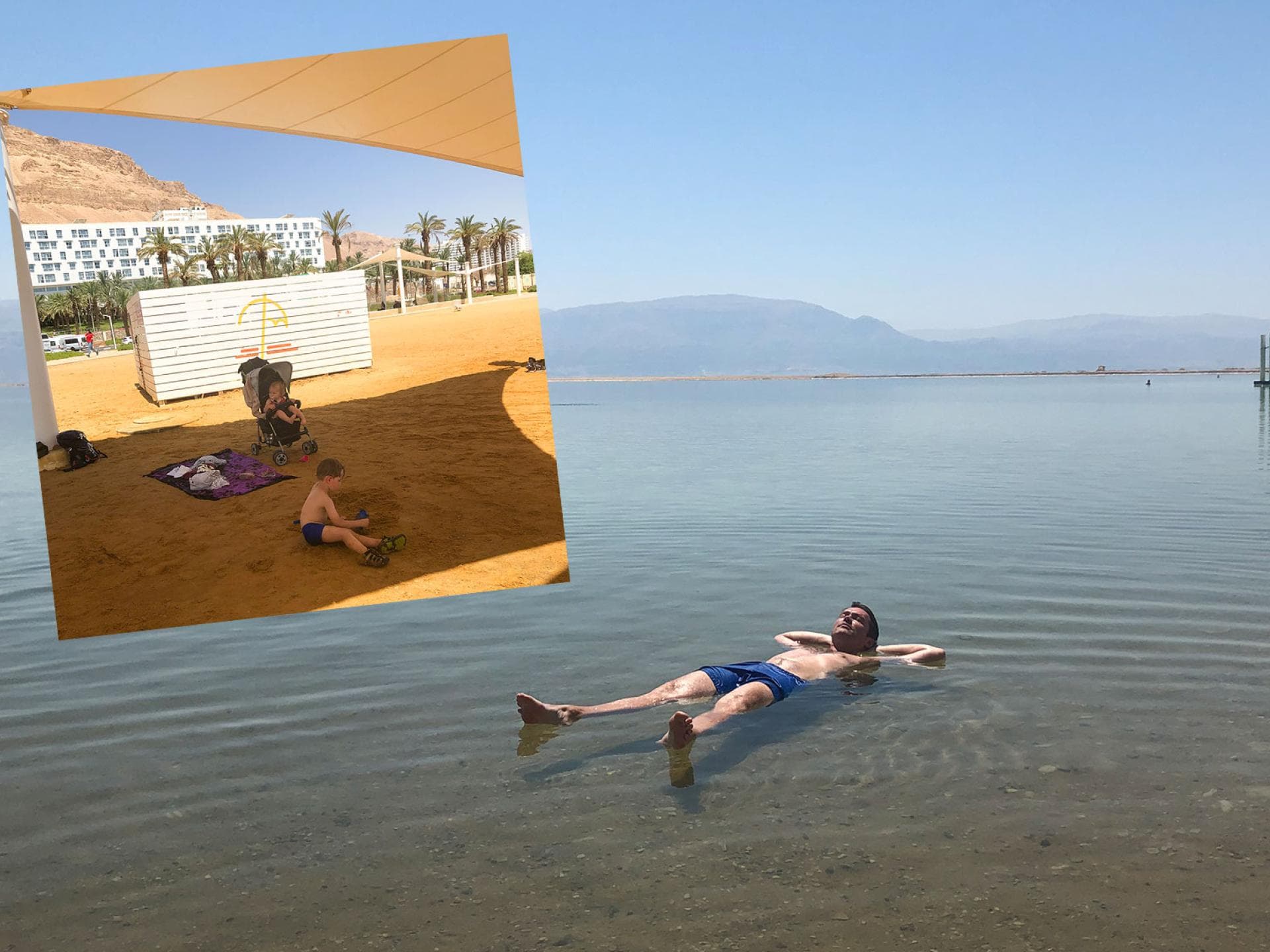 Von den Golanhöhen blicken wir bis nach Syrien und finden einen alten Panzer, der wohl aus dem Syrienkonflikt stammt. Das Tote Meer ist wegen des hohen Mineraliengehalts für Kleinkinder tabu (es darf nicht in die Augen oder an Schleimhäute gelangen), sodass wir Eltern nur kurz zum typischen Treibenlassen ins Wasser gehen und uns mit dem schwarzen Heilschlamm einreiben. Die Kinder spielen derweil unter großen Sonnensegeln im Sand.
