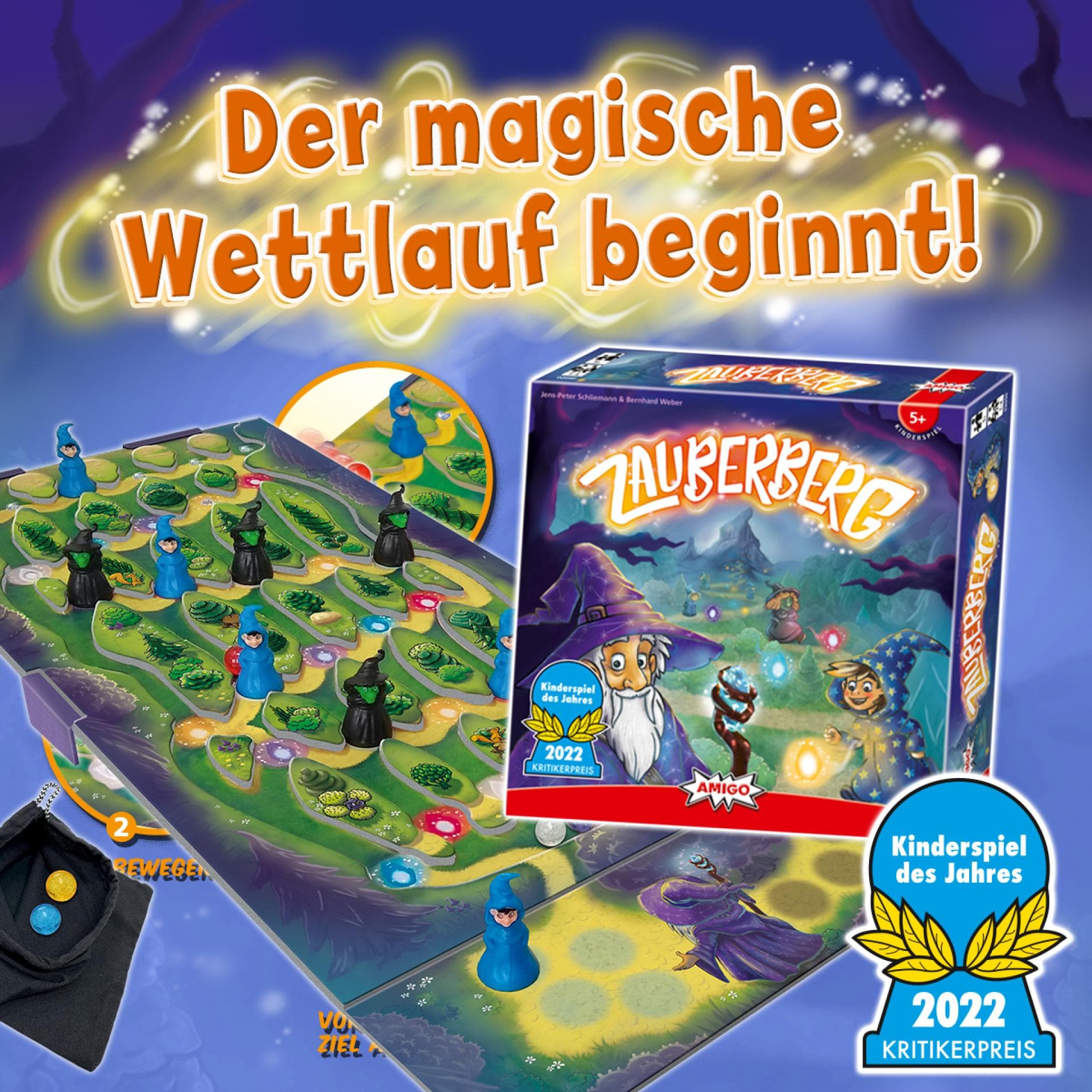 Glänzende Murmeln bahnen sich ihren Weg den Berg hinab, und mit jedem Mal entsteht ein kleines Abenteuer. In Zauberberg, dem "Kinderspiel des Jahres 2022", seid ihr Zauberlehrlinge, die sicher durch den geheimnisvollen Wald ins Tal hinabsteigen, wo der Magier Balduin auf euch wartet. Dafür helfen euch die leuchtenden Irrlichter, die in Form von Murmeln von oben über den Spielplan rollen. Auf ihrem Weg berühren sie Figuren, lenken Entscheidungen und bringen immer neue Wendungen ins Spiel. Doch Vorsicht: Auch Hexen folgen den Spuren und ein Wettlauf beginnt.