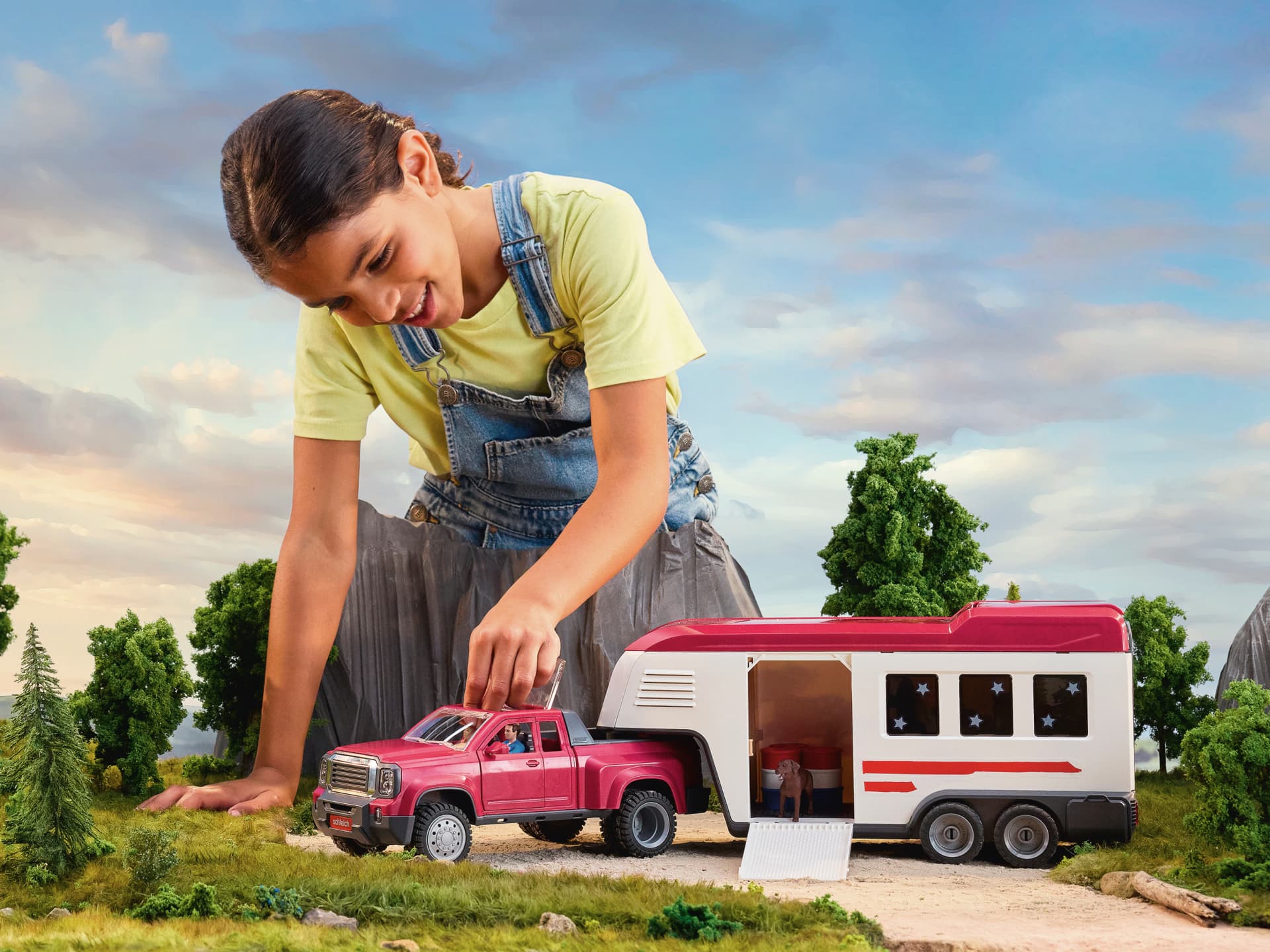 Im Lakeside Truck mit Anhänger bringen Hannah und Mr. Kramer die zwei Pferde zum Western-Abenteuer. Im Anhänger befinden sich stabile Boxen. Die Labrador Retriever Hündin ist auch dabei. Aus dem Dach des Anhängers bauen sie einen Unterstand. Barrels und Stangen fürs Training unterwegs dürfen nicht fehlen. Natürlich gibt es auch Sättel, Zaumzeug, Striegel und Kardätsche sowie Heu und ein paar Karotten zur Belohnung.