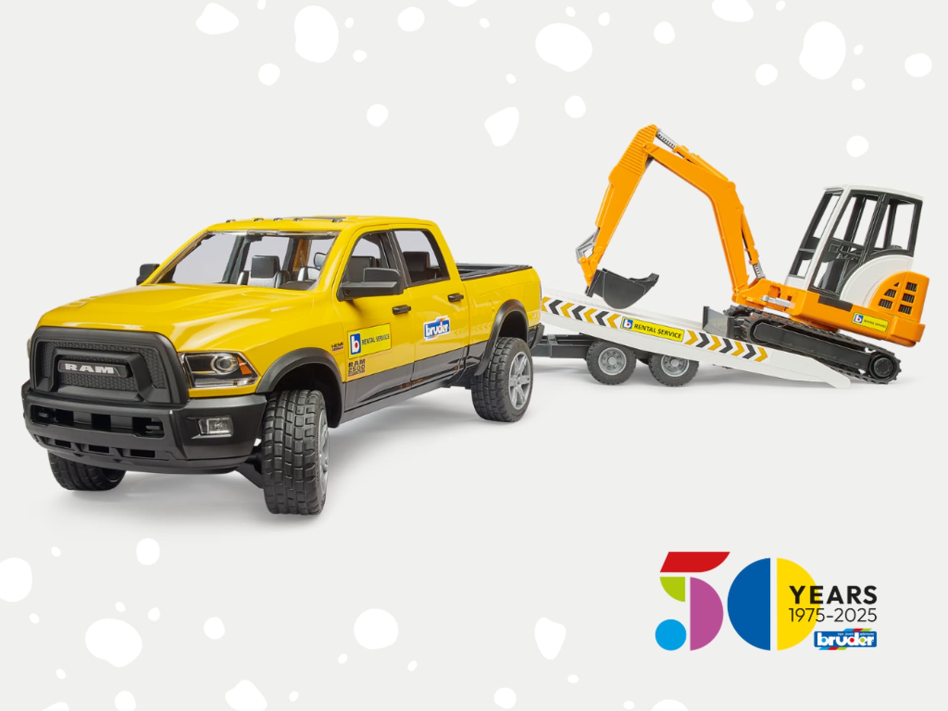 Ob beim Einsammeln bunter Kugeln oder Bauen einer Schneeburg - der RAM Rental Service mit Minibagger von BRUDER Spielwaren ist für jede Baustellen-Mission bereit! Mit seinem 360° drehbaren Führerhaus, der beweglichen Schaufel und dem höhenverstellbaren Räumschild hat der Bagger alles im Griff. Im Nu wird er auf den coolen RAM verladen und fährt los ins nächste Weihnachtsabenteuer.