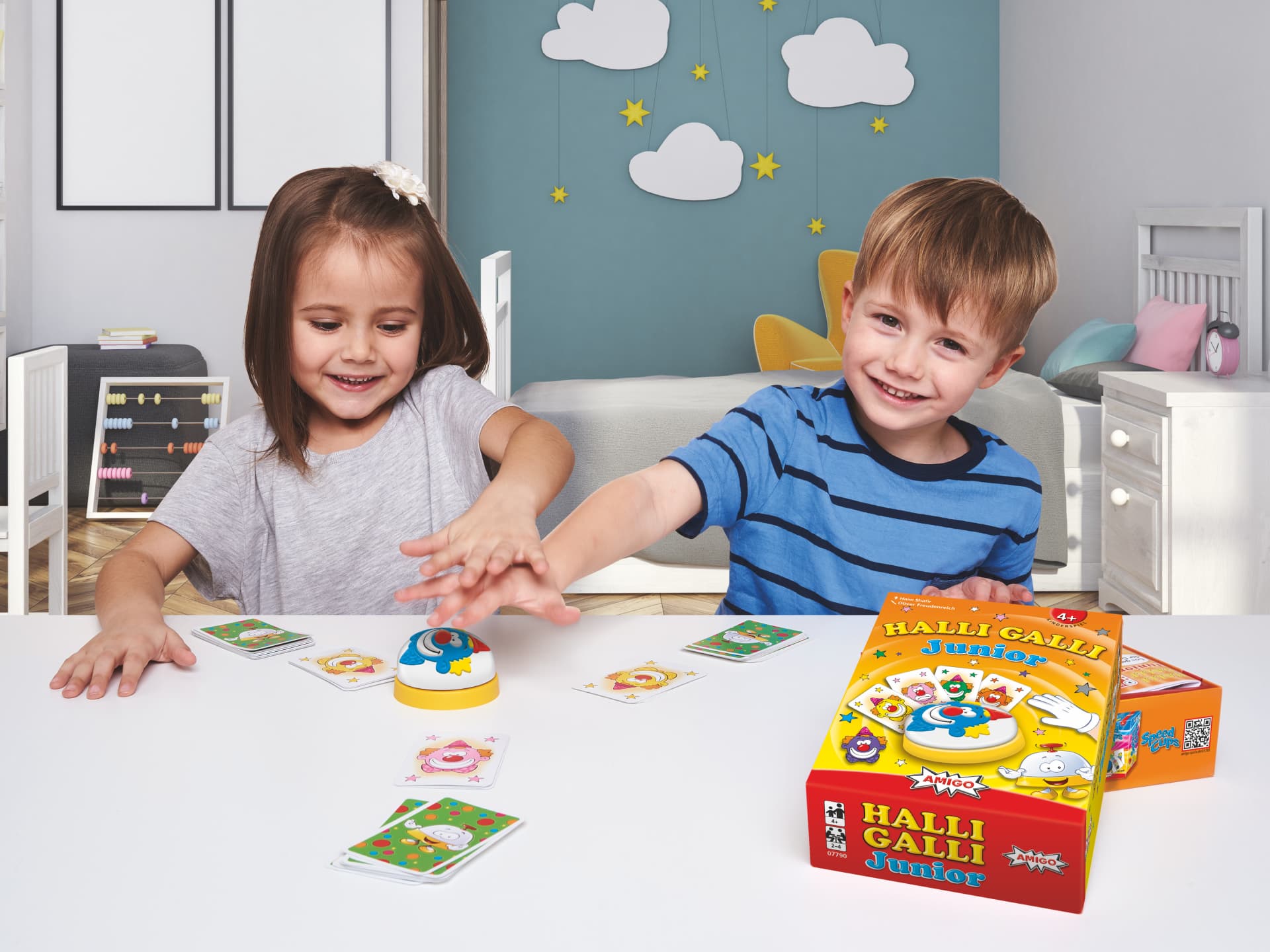 Wie schon beim furiosen Dauerbestseller geht es auch in der Halli Galli Junior-Variante konzentriert und blitzschnell zur Sache. Hier liegen rote, grüne oder blaue Clowns auf dem Tisch. Wenn zwei lachende Clowns derselben Farbe zu sehen sind, müsst ihr blitzschnell klingeln. Wer am Ende die meisten Karten hat, gewinnt!