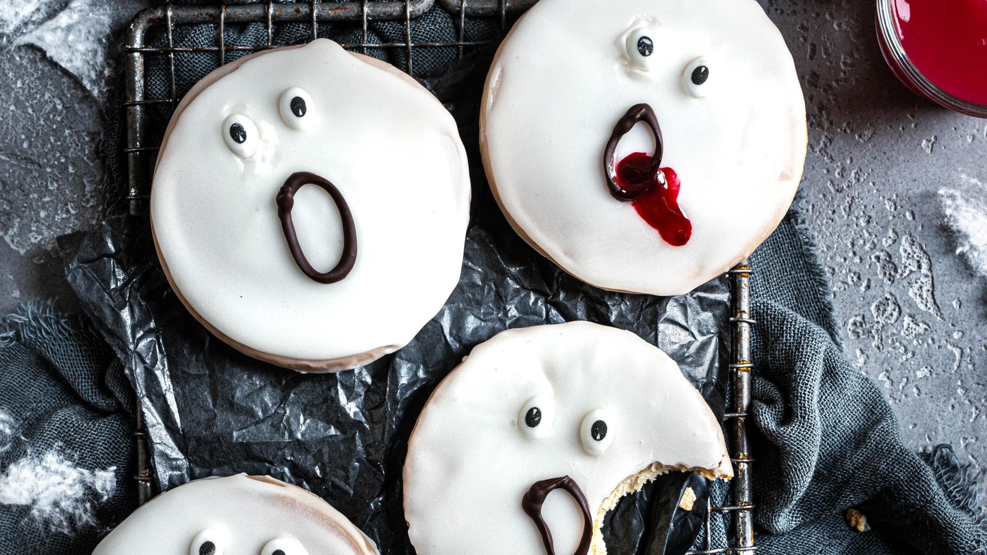 - Die Schokolade grob hacken, im heißen Wasserbad schmelzen, in einen Gefrierbeutel geben und eine kleine Ecke abschneiden. Mit der flüssigen Schokolade auf den getrockneten Zuckerguss der Mini-Amerikaner "Geister-Gesichter" zeichnen. Mit Zuckerguss Augen ankleben. Nach Belieben mit etwas Zuckerschrift in Rot "Blutspuren" ergänzen. Trocknen lassen.