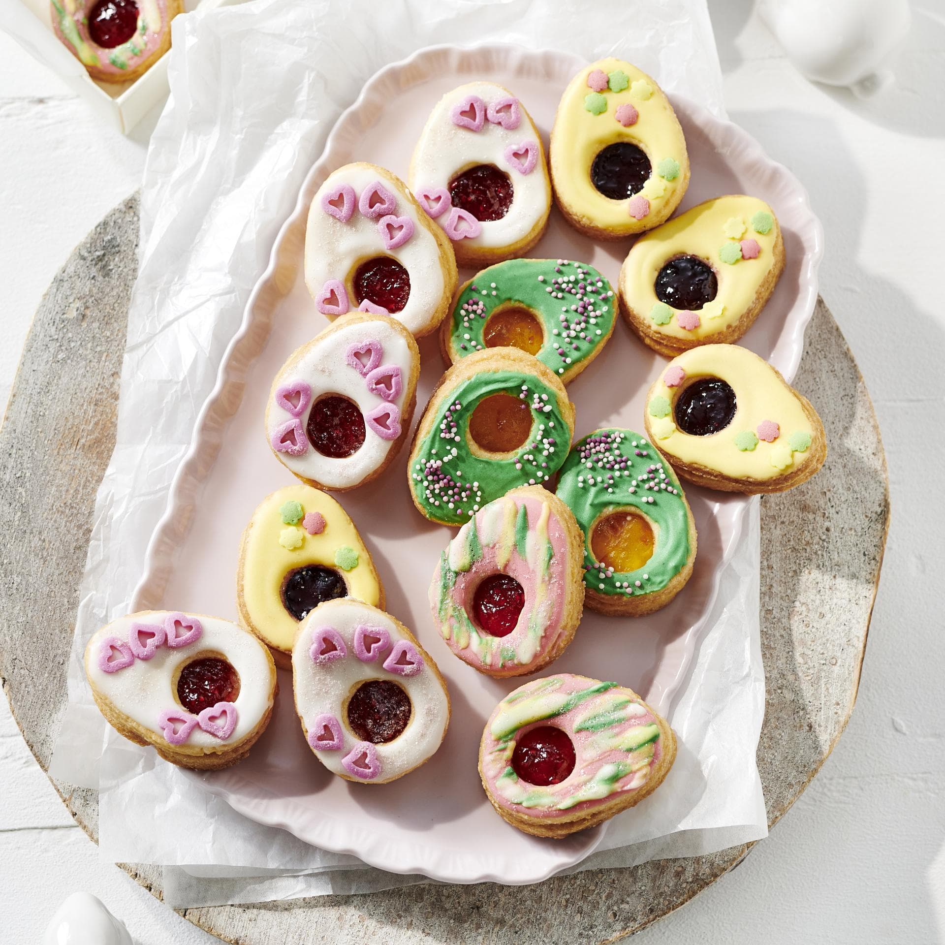 2. Den Backofen auf 180 Grad vorheizen, Backbleche mit Backpapier belegen. Den Teig zwischen Backpapier ca. 5 mm dick ausrollen und mit einem Osterei-Ausstecher (ca. 9 cm lang, 7 cm breit) Kekse ausstechen. Von der Hälfte der Kekse im unteren Drittel mittig einen Kreis (Durchmesser ca. 1,5 cm) ausstechen, alle Kekse auf die vorbereiteten Backbleche verteilen und im vorgeheizten Backofen ca. 15 Min. goldbraun backen.
