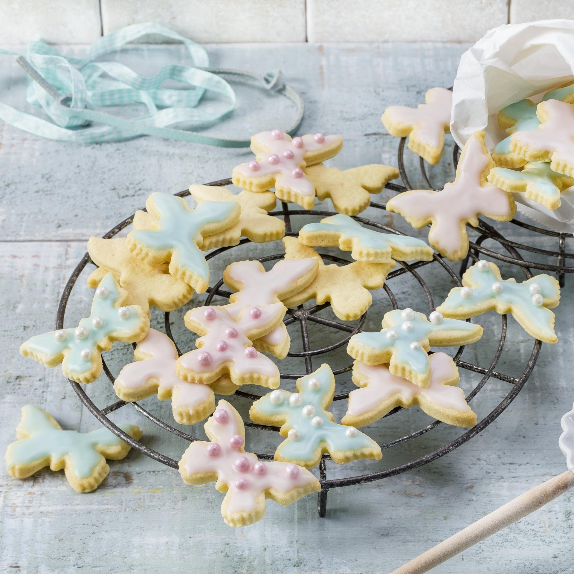 3. Den Backofen auf 160 Grad Umluft vorheizen und zwei Backblech mit Backpapier belegen. Den Teig auf der bemehlten Arbeitsfläche ca. vier Milimeter dick ausrollen und mit einer entsprechenden Form Schmetterlinge ausstechen. Diese auf den Backblechen verteilen und im Ofen ca. zwölf Min. backen. Herausnehmen und vollständig abkühlen lassen.