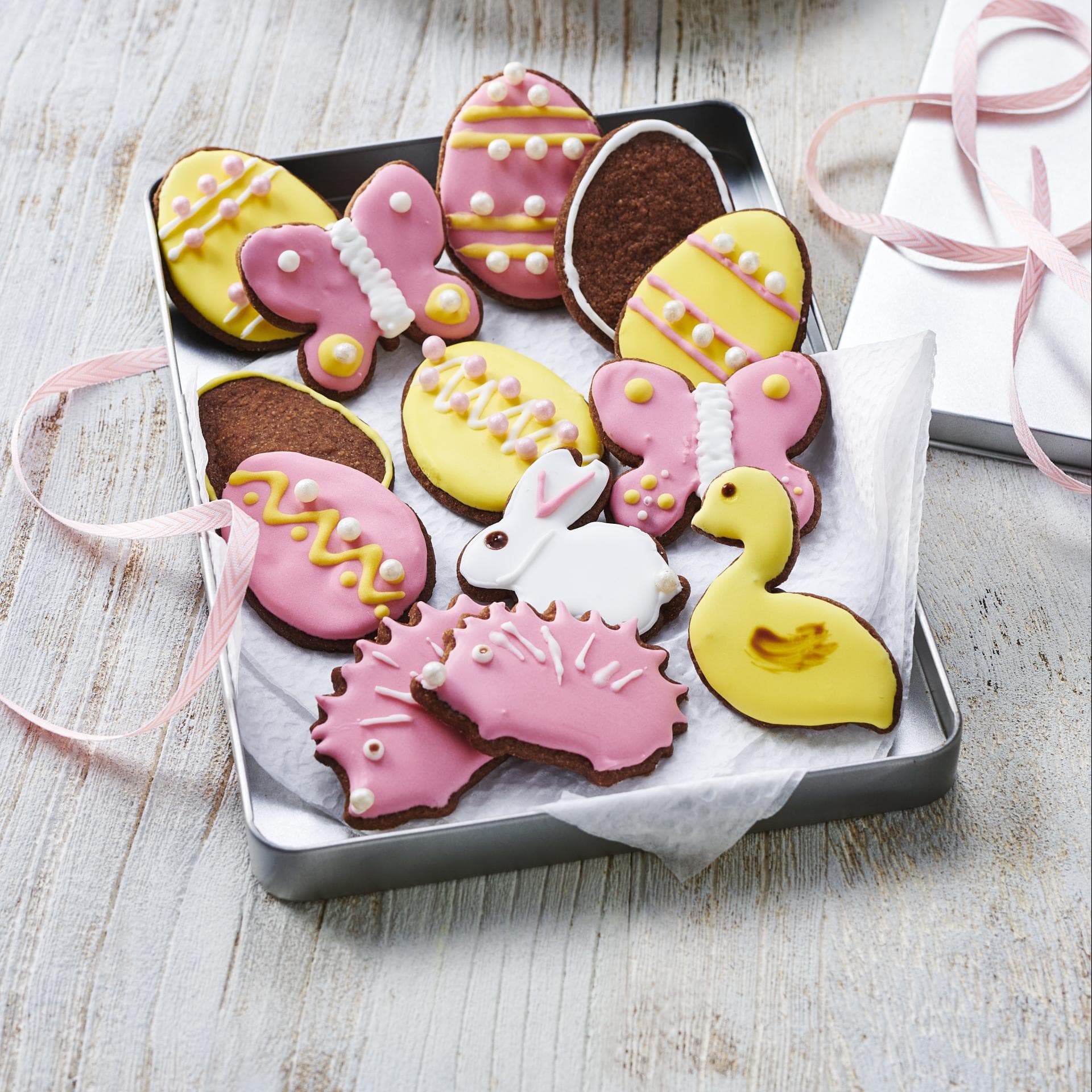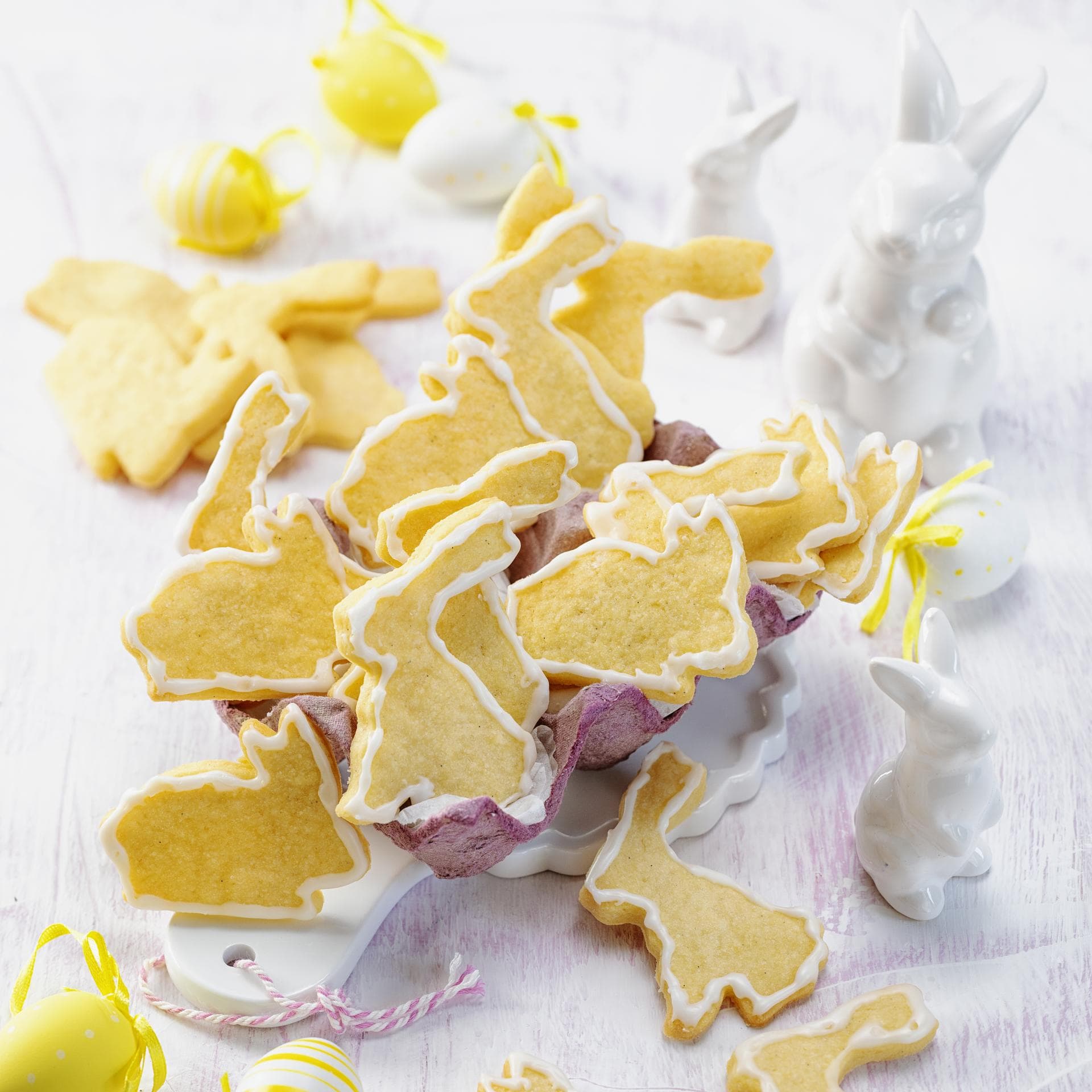 2. Den Backofen auf 180 Grad vorheizen. Den Teig zwischen Backpapier ausrollen, saisonale Formen ausstechen (z.B. Eier, Hasen, Küken, Schmetterlinge, Igel), auf dem mit Backpapier belegten Ofenblech in 10–12 Min. backen. Auf Kuchengittern vollständig auskühlen lassen.
