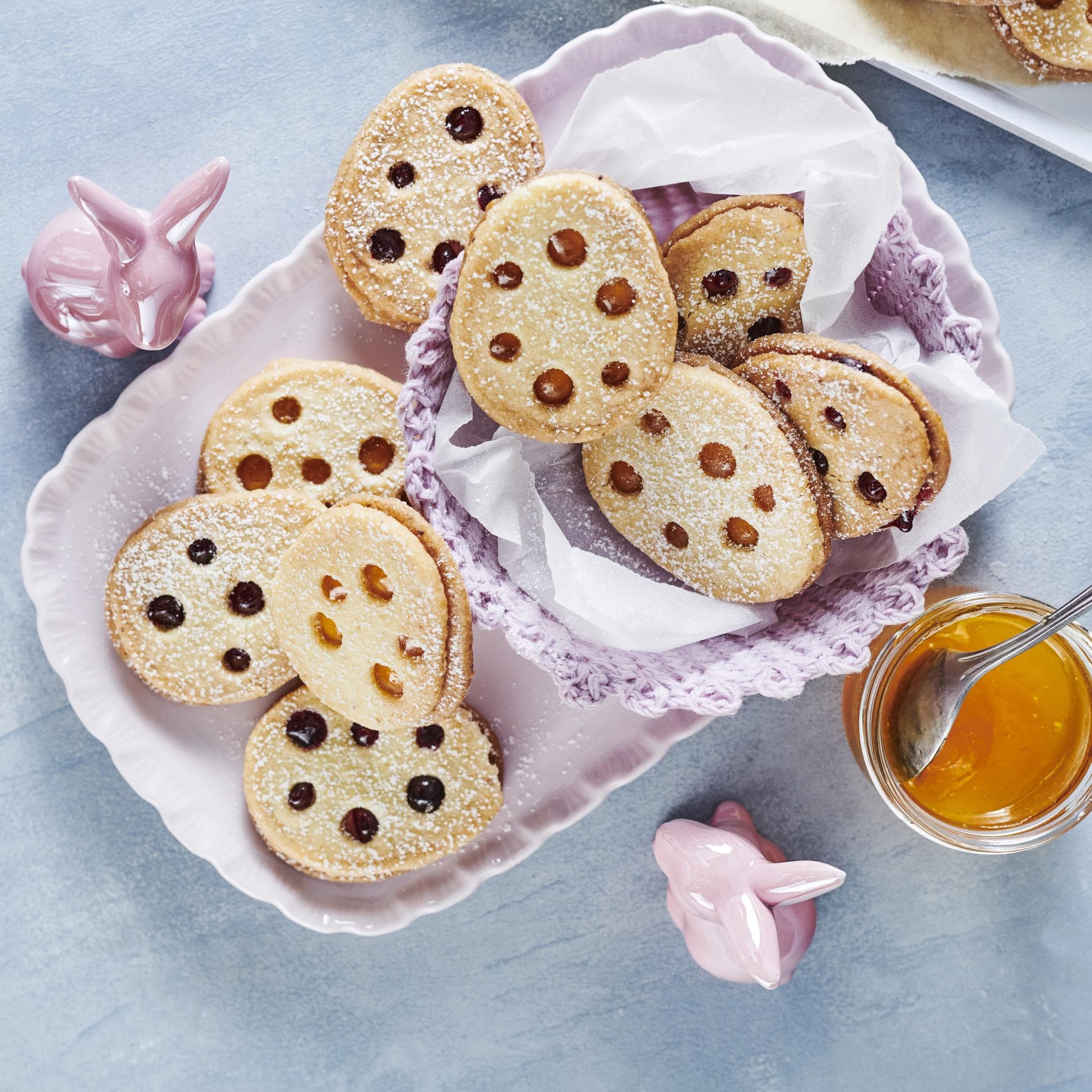2. Mit einem eiförmigen Ausstecher Kekse ausstechen. Aus der Hälfte der Kekse zusätzlich kleine Löcher ausstechen. Auf das Backblech legen und in den Ofen (Mitte) schieben. Die Kekse in ca. 8-10 Min. hellgelb backen. Herausnehmen, vom Blech ziehen und auf einem Gitter abkühlen lassen.