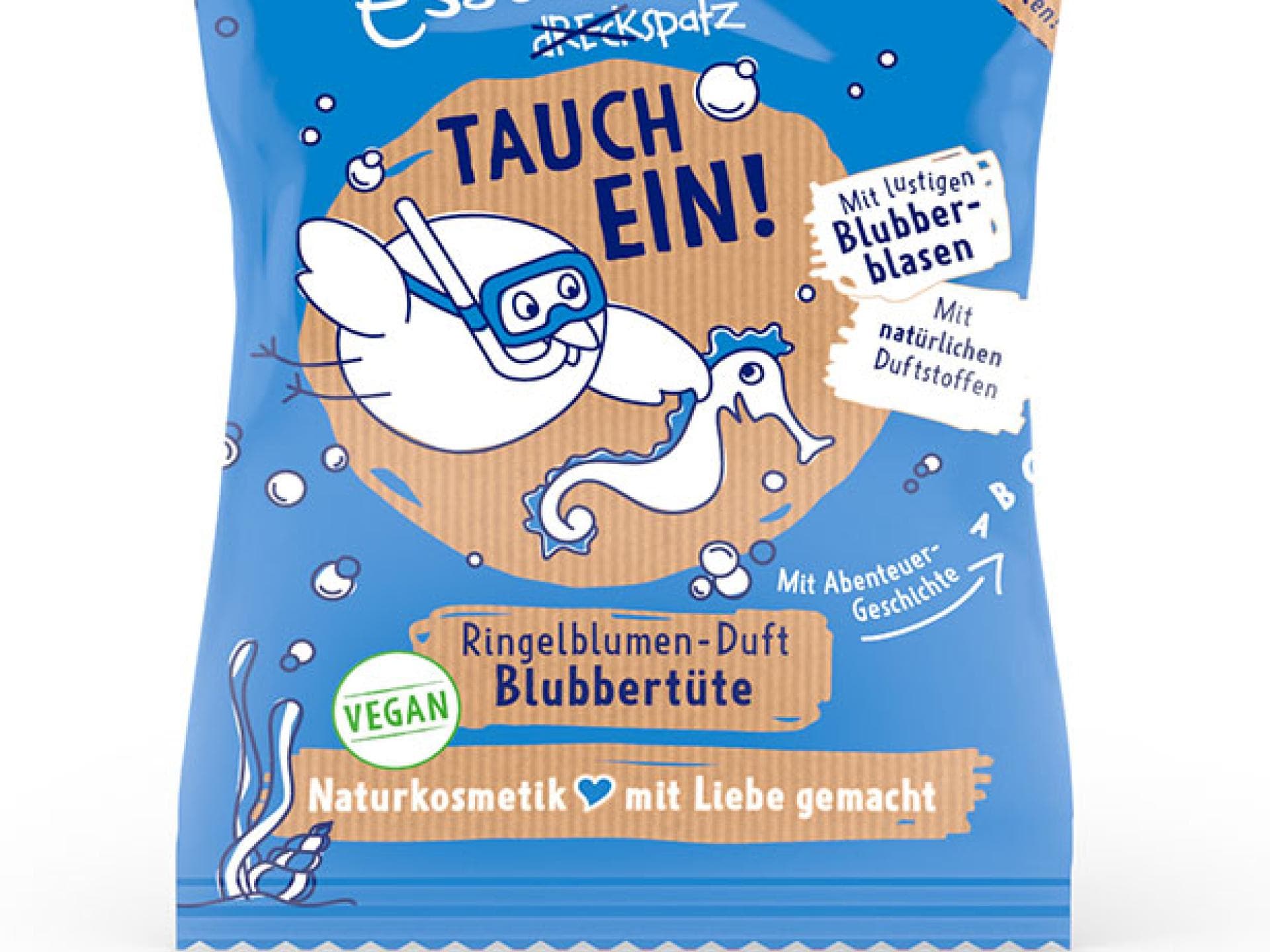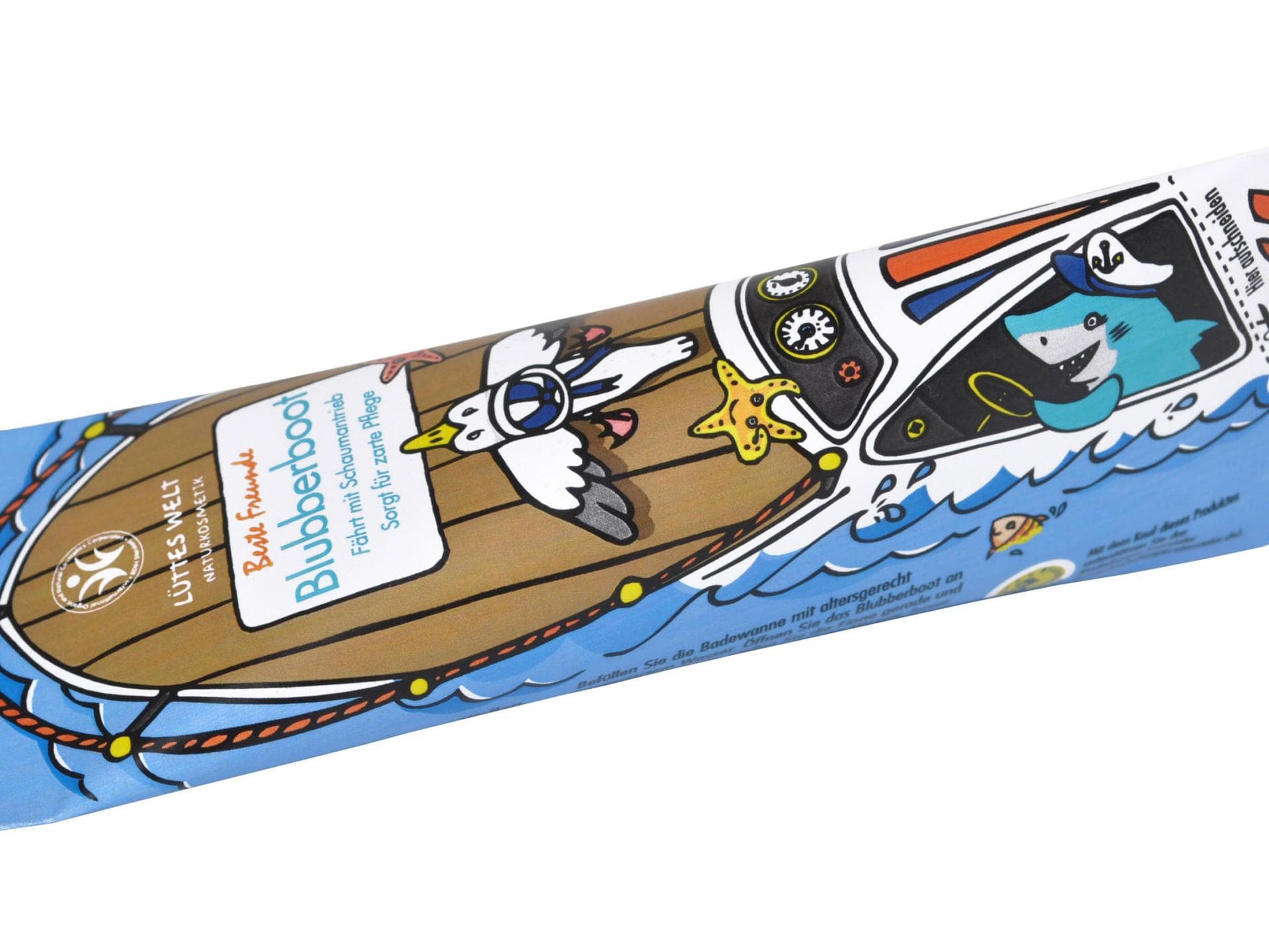 Das Blubberboot ist wirklich abgefahren: Sobald warmes Wasser in die Verpackung strömt, "zündet" der Blubberantrieb und lässt es durch die Wanne fahren. Der dabei entstehende himmelblaue Schaum besteht zu 100 Prozent aus BDHI-zertifizierter Naturkosmetik.