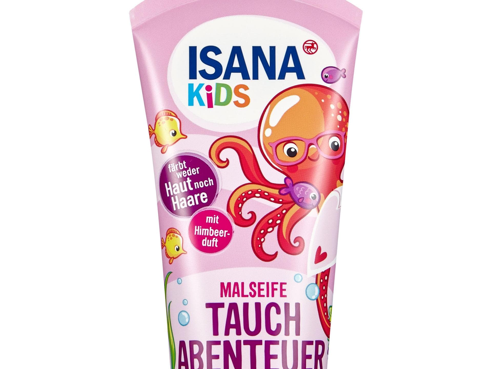 Mit der "Malseife Tauchabenteuer" können kleine Wasserratten sich von Kopf bis Fuß rosa anmalen – Haut und Haare werden dabei nicht gefärbt, duften aber anschließend nach Himbeere.