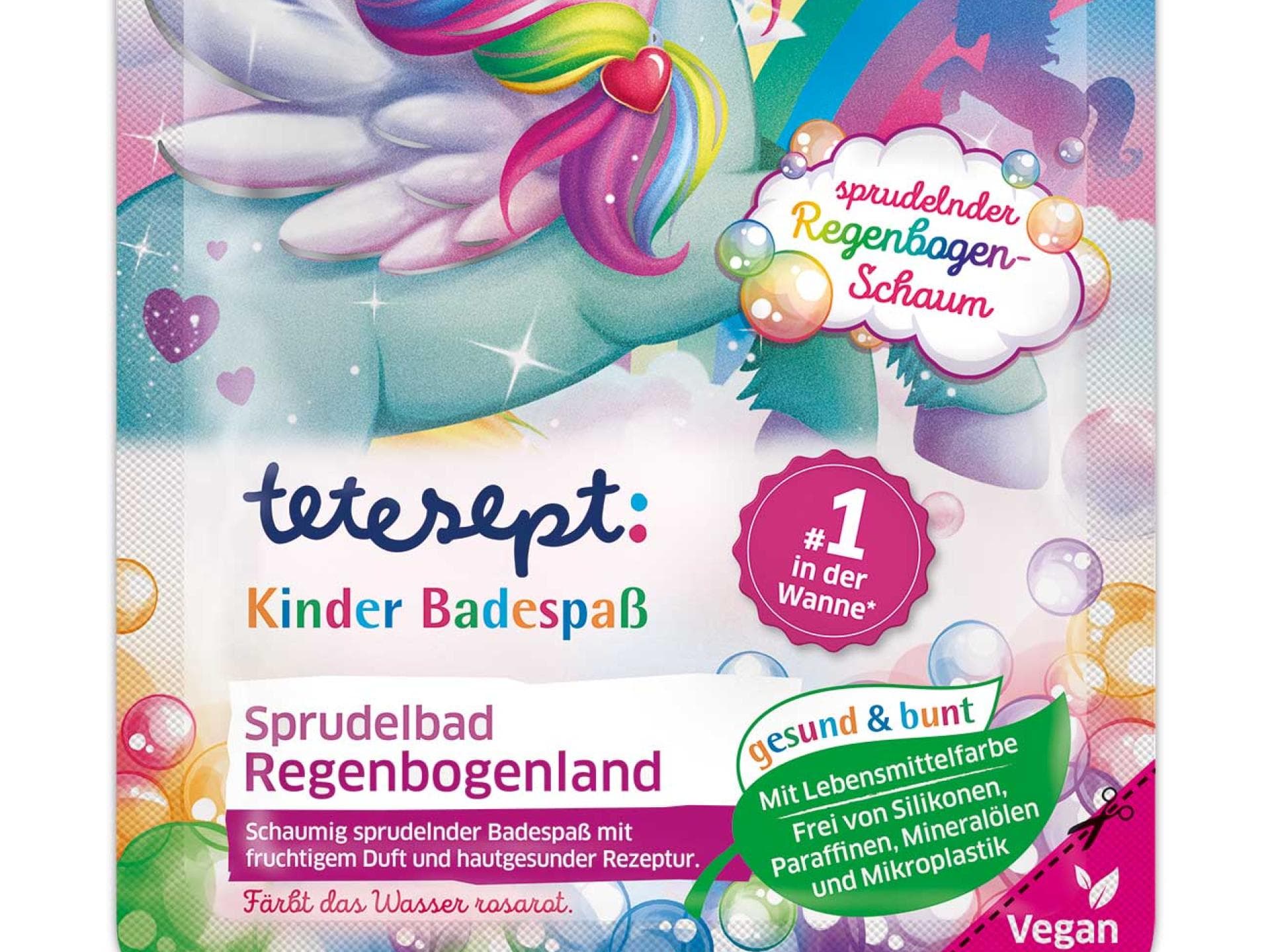 Das "Sprudelbad Regenbogenland" färbt das Wasser und den Schaum rosarot und verströmt dabei einen fruchtigen Duft. Die Verpackung kann zusätzlich als Fingerpupe zum Spielen verwendet werden.