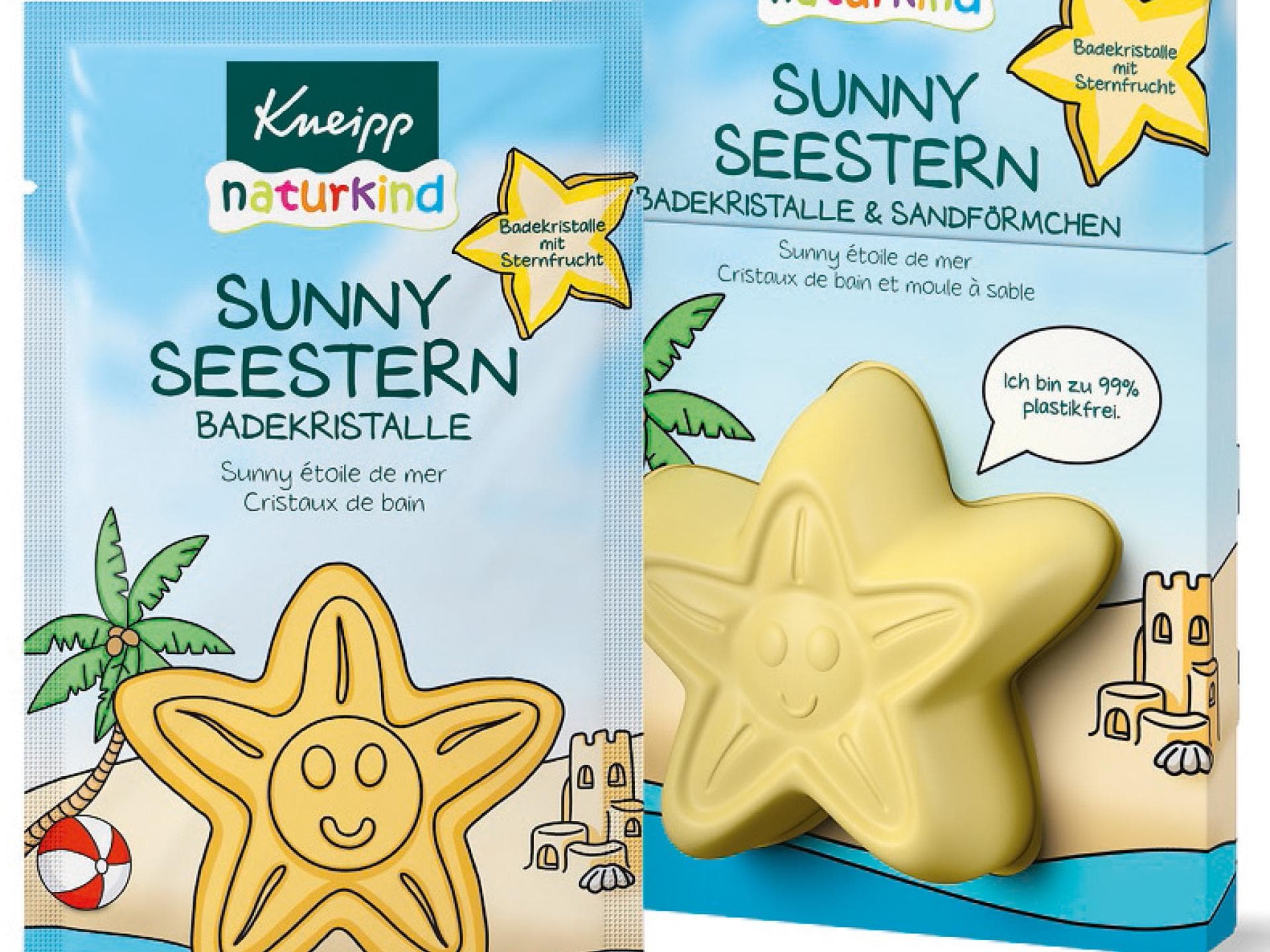 "Sunny Seestern" verwandelt das Badezimmer in ein tropisches Paradies: Die Badekristalle duften nach Sternfrucht, obendrauf gibt es noch eine aus 99 Prozent biobasiertem Rohstoff hergestellte Sandkastenform.