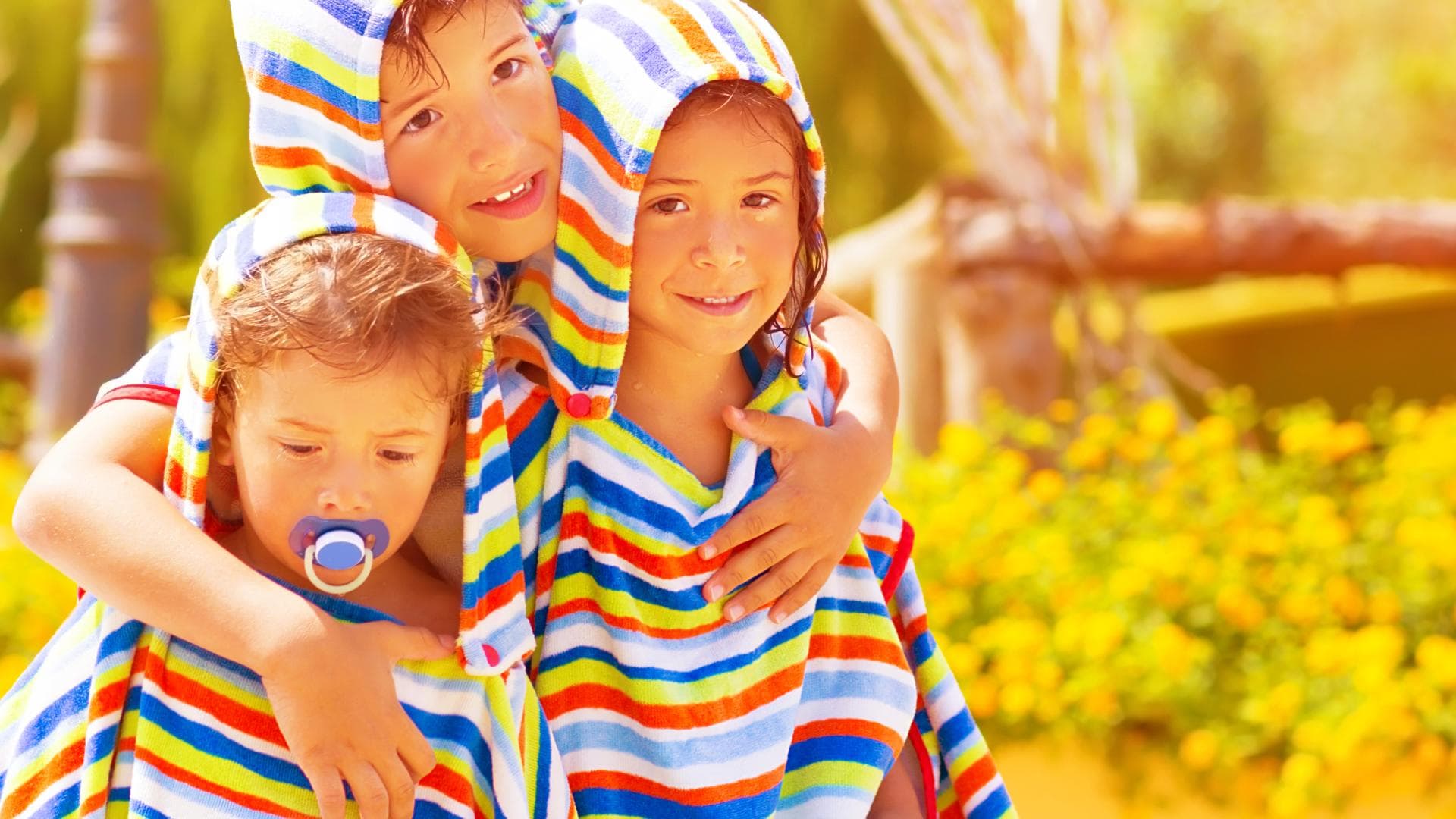 Super-kuscheliger Baumwoll-Poncho mit Kapuze und kurzen Ärmeln – perfekt für einen ausgelassenen Tag am Strand. Gibt es in drei Größen für Kids von drei bis 13 Jahre.