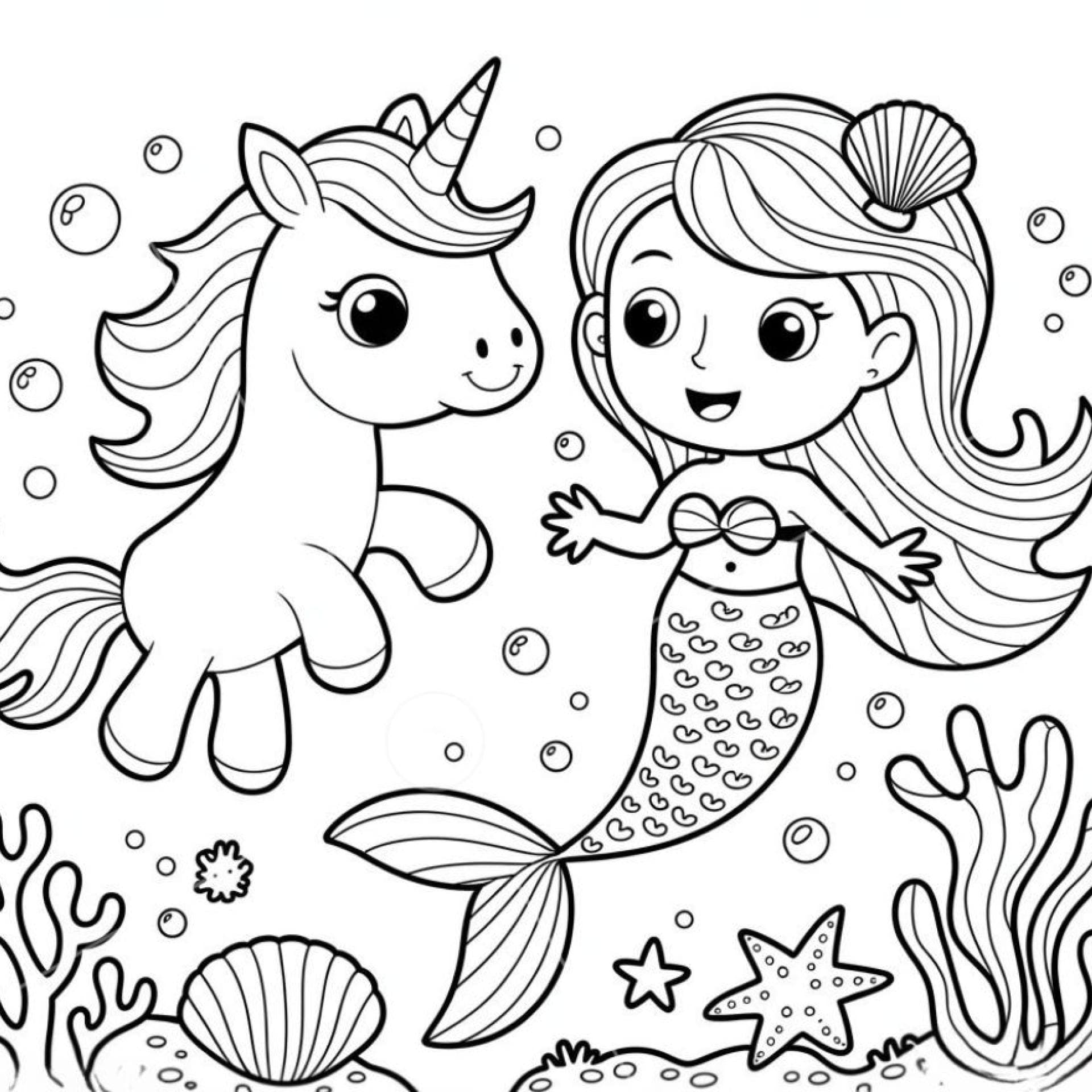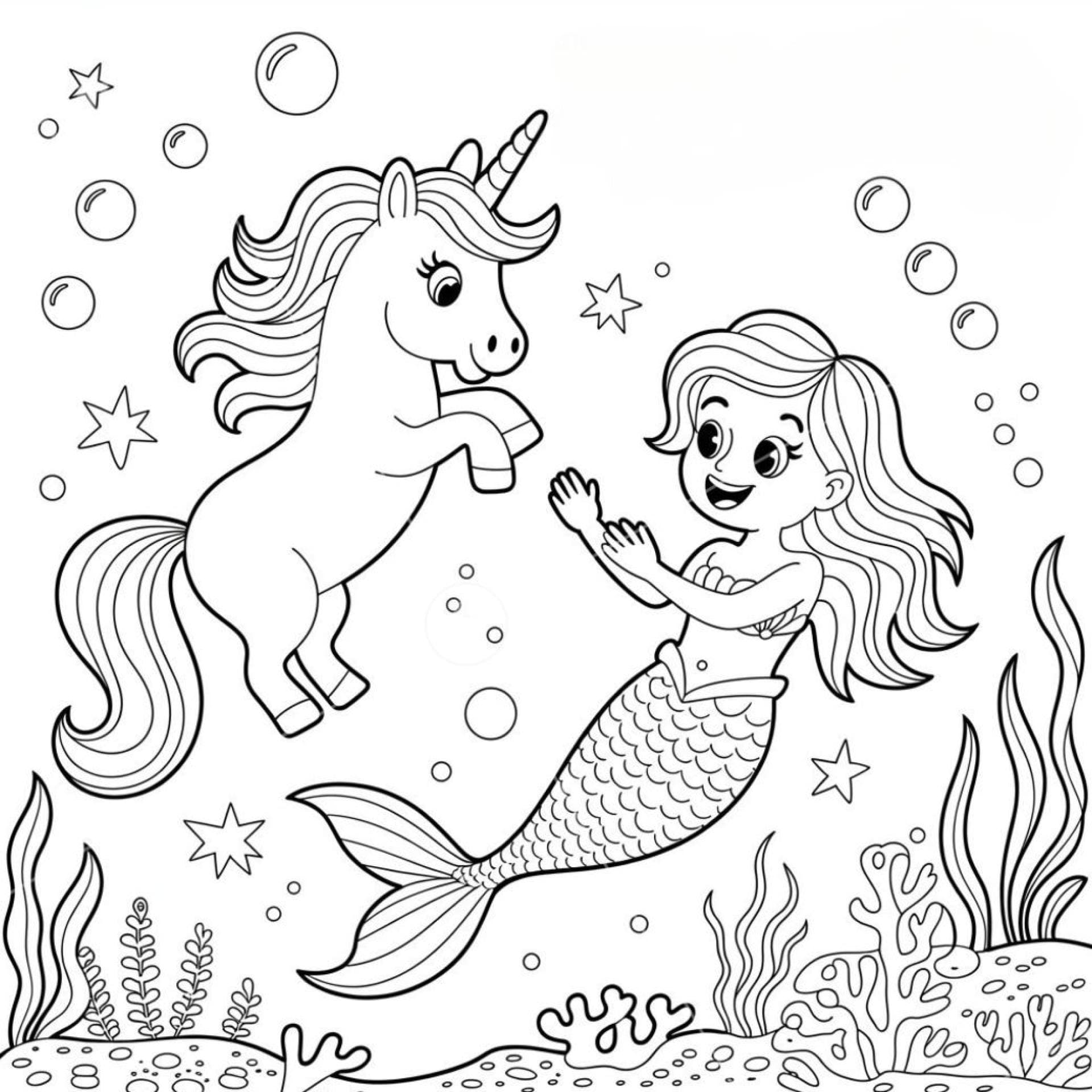 Ausmalbilder mit Einhorn und Meerjungfrau