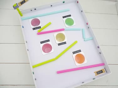 - Ein paar Strohhalme zerschneiden und die Stücke sowie ganze Strohhalme auf den Karton kleben (am besten mit der Heißklebepistole). Je mehr Strohhalme, desto höher der Schwierigkeitsgrad.
