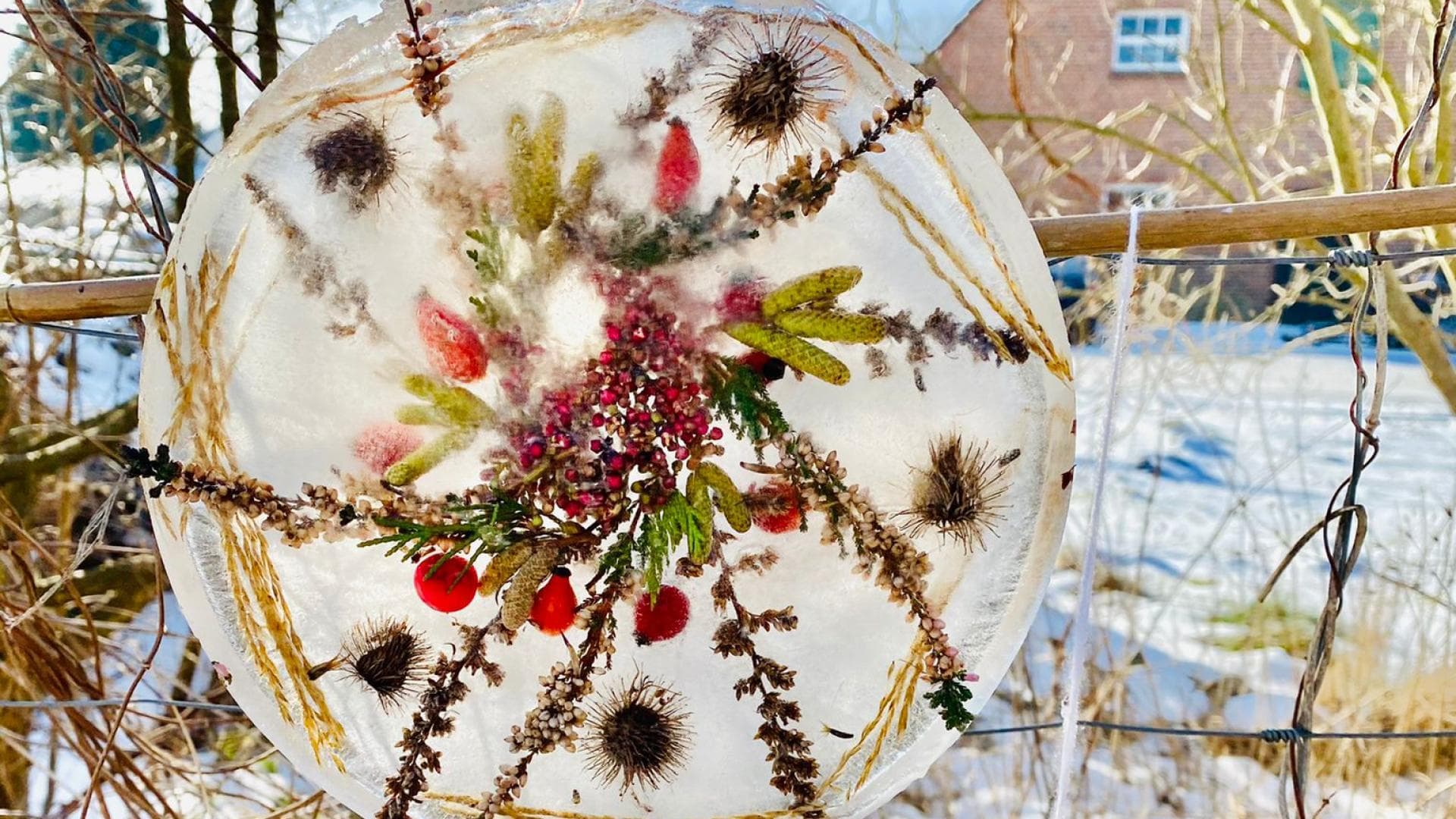 - Am nächsten Morgen vorsichtig aus dem Teller herauslösen, aufhängen und an der hübschen Eisscheibe erfreuen.