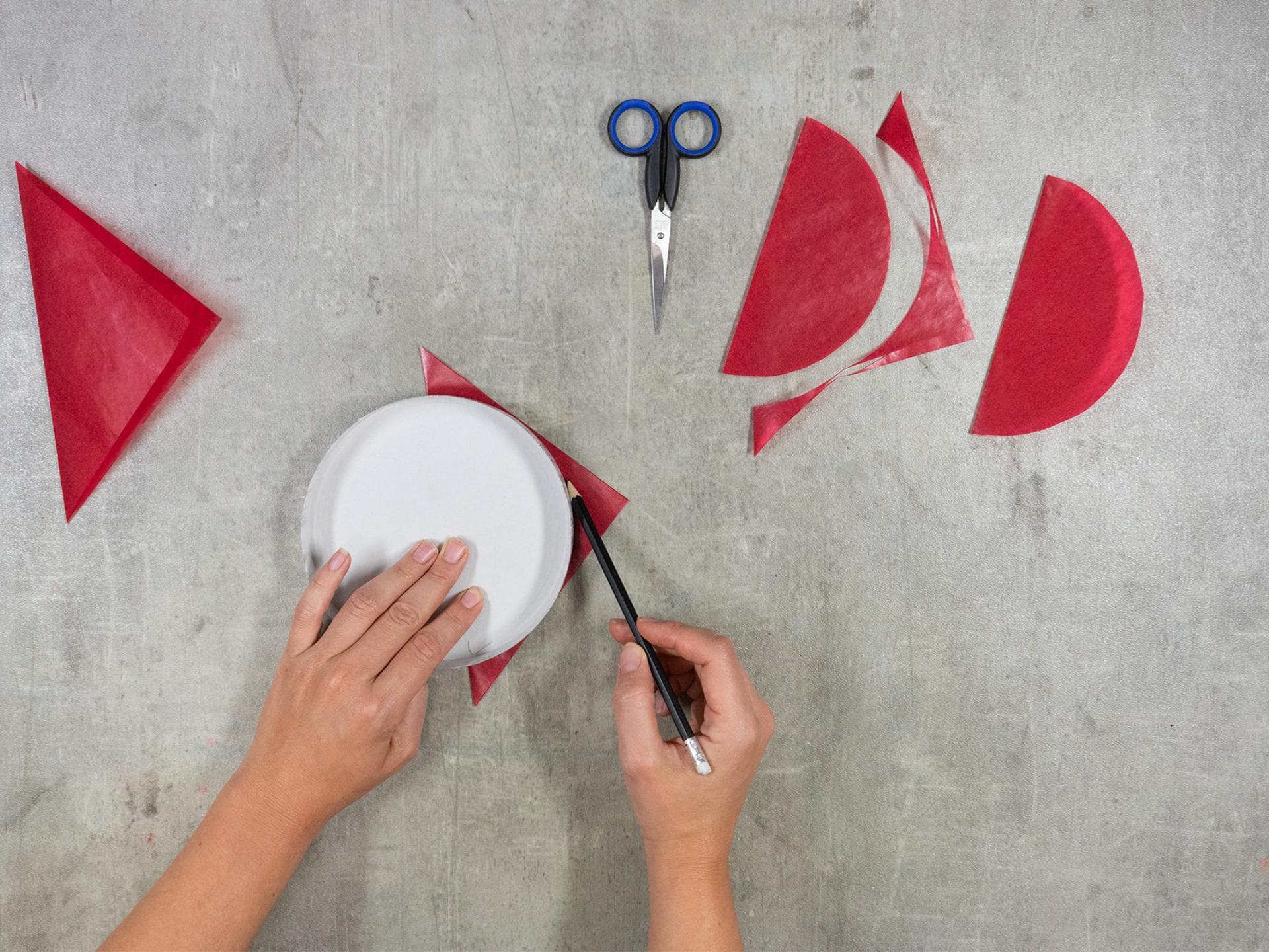 Bereitet als Erstes die Flügel des Marienkäfers vor. Dafür faltet ihr vier rote Transparentpapier-Faltblätter zusammen diagonal zur Hälfte. Dann nutzt ihr eine Hälfte der Käsedose als Schablone, legt sie halb in das Dreieck und schneidet den Halbkreis aus.