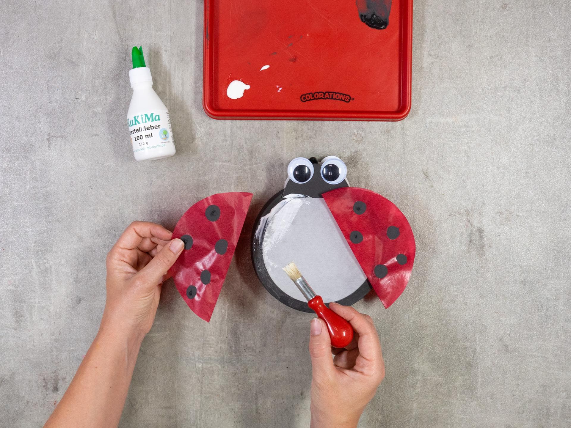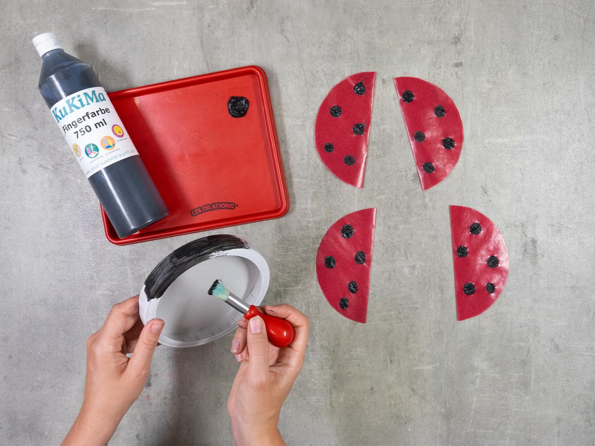 Aus dem ausgeschnittenen Kreis macht ihr dann den Kopf des Marienkäfers. Nutzt die Fingerfarben-Flasche als Schablone, um einen Kreis zu zeichnen. Schneidet ihn aus und halbiert ihn.