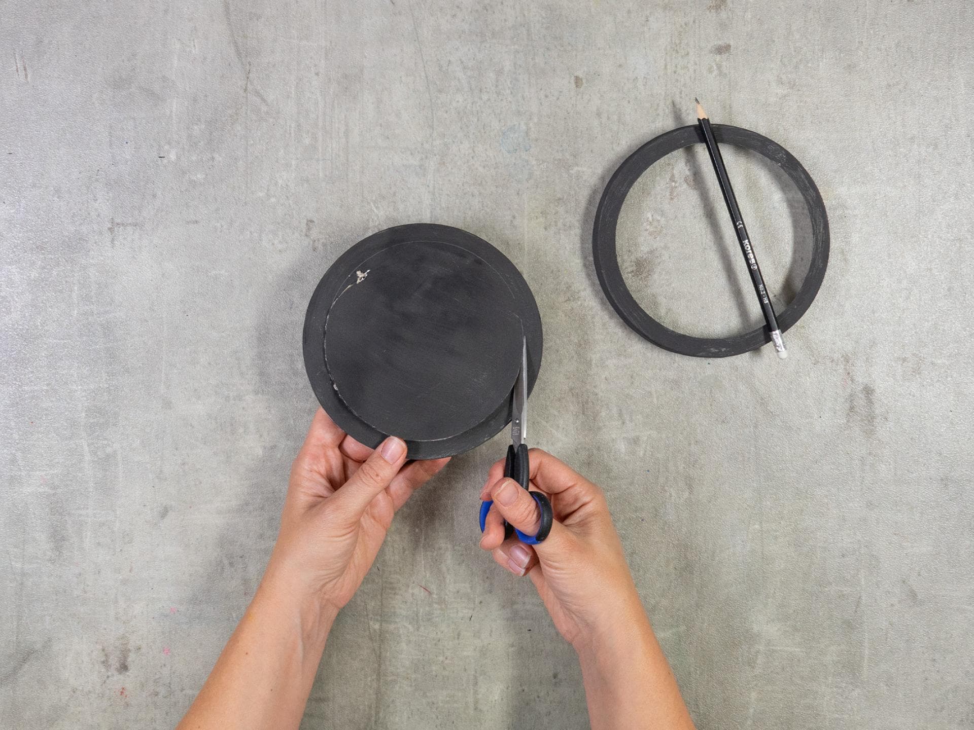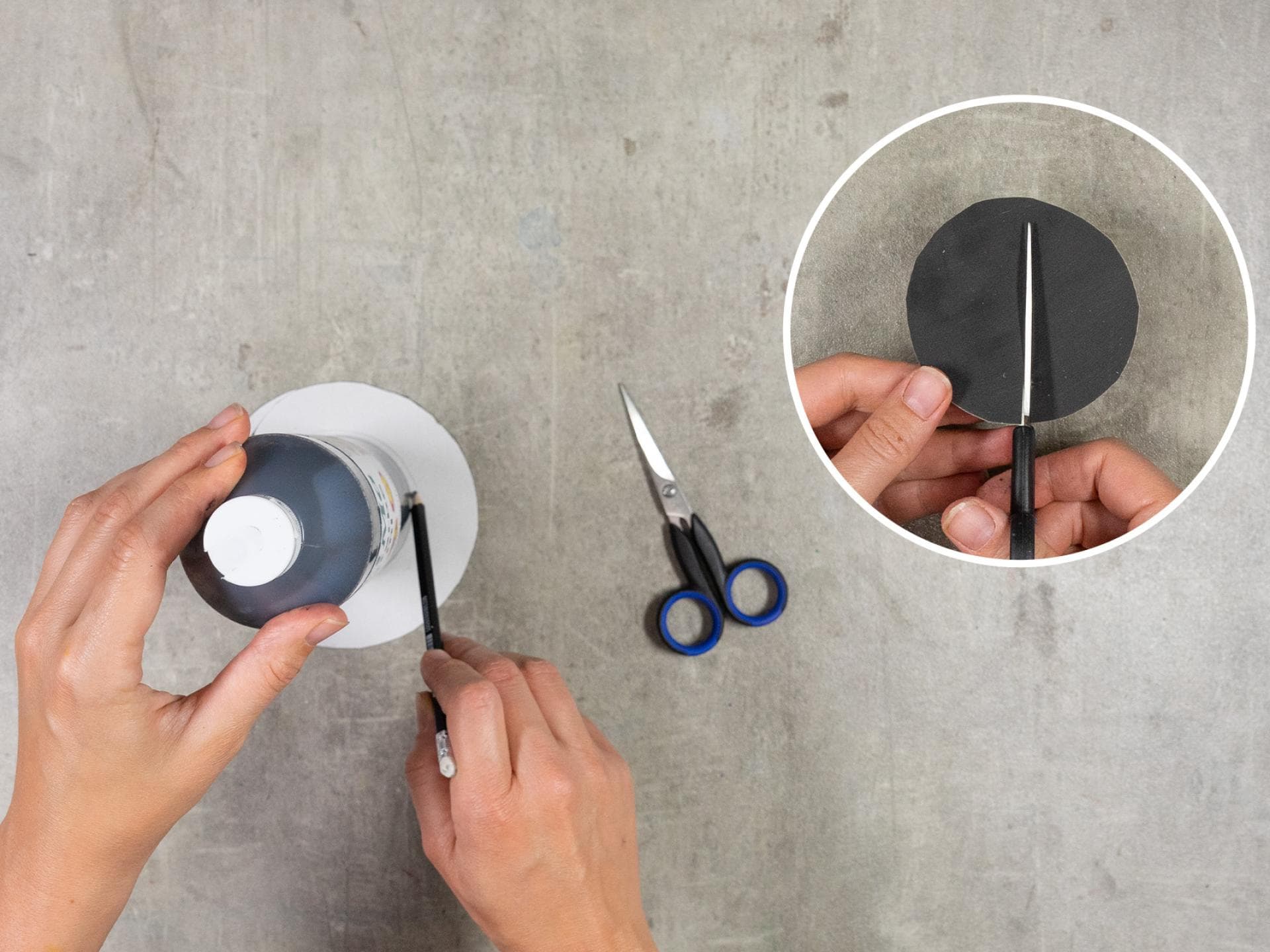 Ist die Käsedose trocken, schneidet den Kreis auf der Rückseite aus, damit beide Seiten das gleiche Fenster haben. Nehmt dazu die Vorderseite als Schablone, legt sie auf die Rückseite und zieht den inneren Kreis mit Bleistift nach. Anschließend ausschneiden.