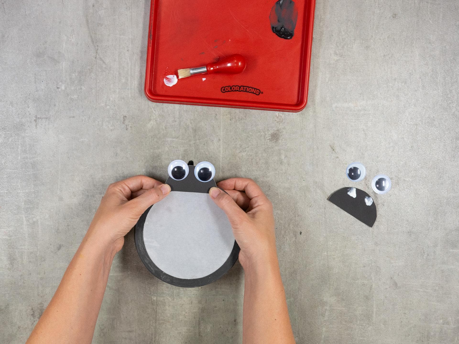 Klebt jeweils zwei Wackelaugen auf die beiden in Schritt 4 vorbereiteten Halbkreise. Anschließend fixiert diese auf beiden Seiten der Käsedosen-Öffnung. So überdeckt ihr auch gleich den durchgesteckten Pfeifenputzer.