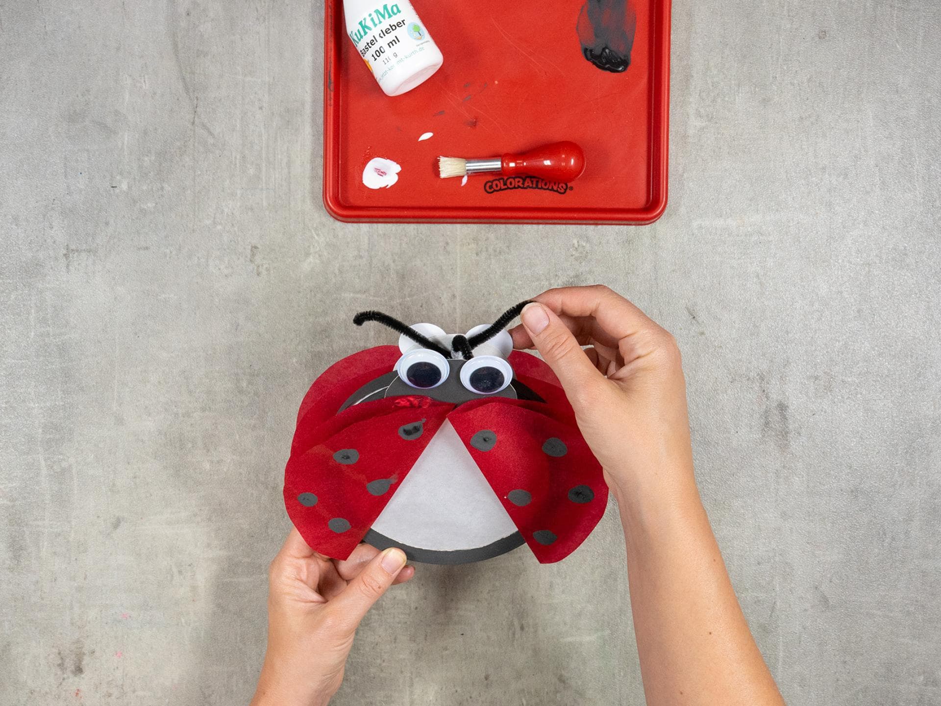 Biegt zum Schluss aus der verbliebenden Pfeifenputzer-Hälfte Fühler und klebt sie hinter dem Kopf fest.